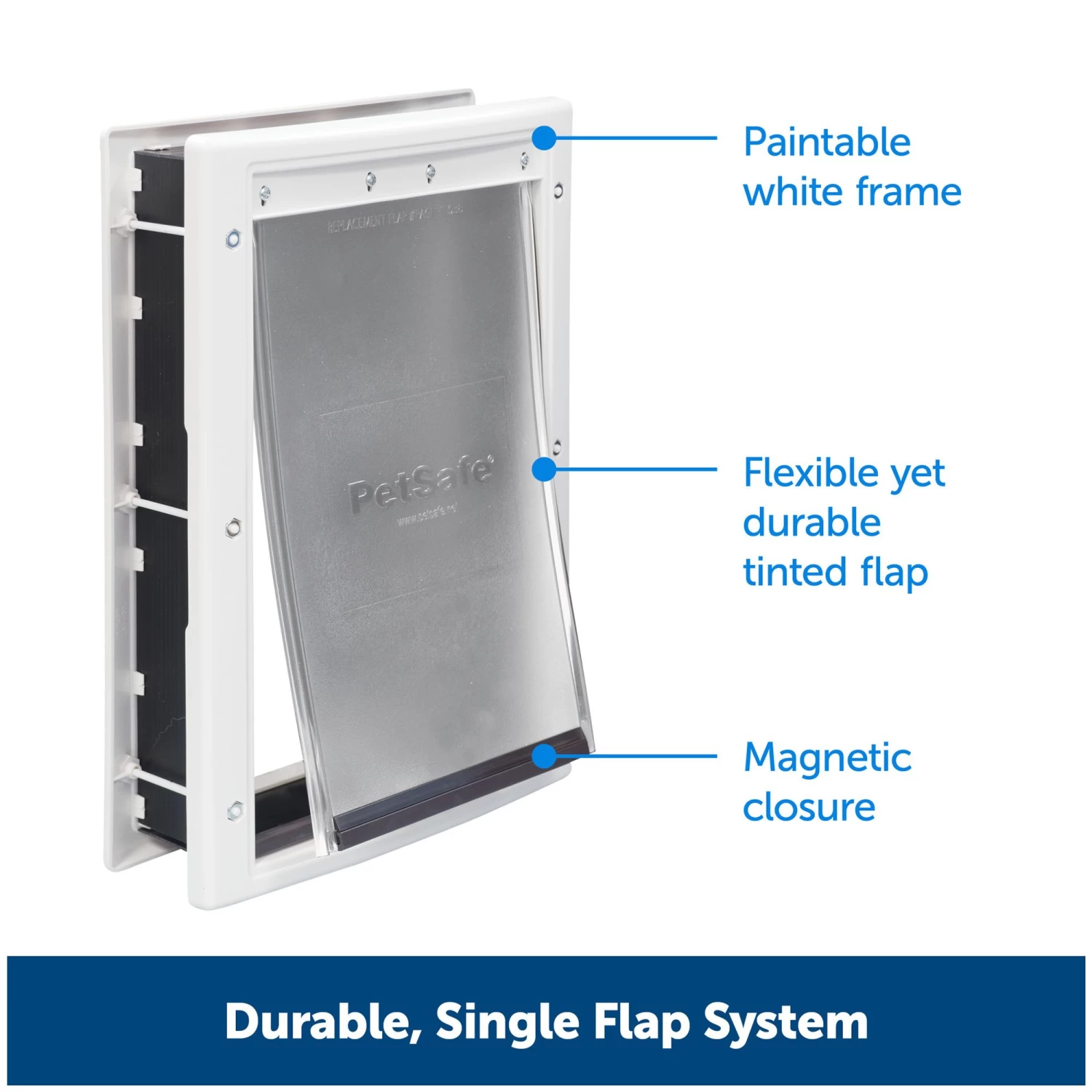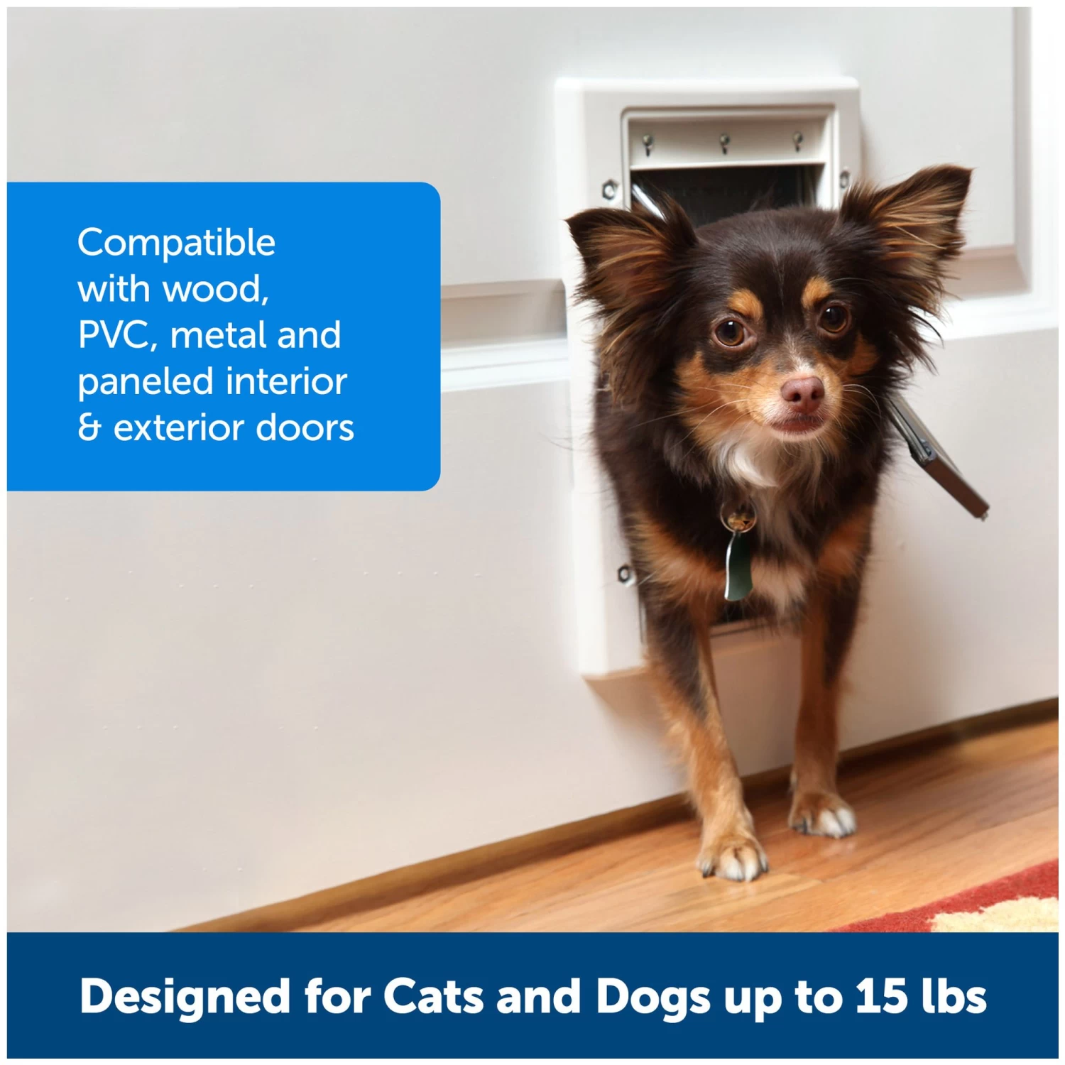 The PetSafe Plastic Pet Door lets your dog go outside for potty breaks and playtime on their own schedule. The white pet door frame is paintable, so you can customize the color to match your home decor. Installing the pet door is a simple DIY project. The pet door installs in interior or exterior wood, PVC, metal and paneled doors. A snap-on closing panel is included so you can control your cat or dog’s access and keep other animals from coming into your home. This durable, plastic pet door comes in 4 sizes to best fit your pet.