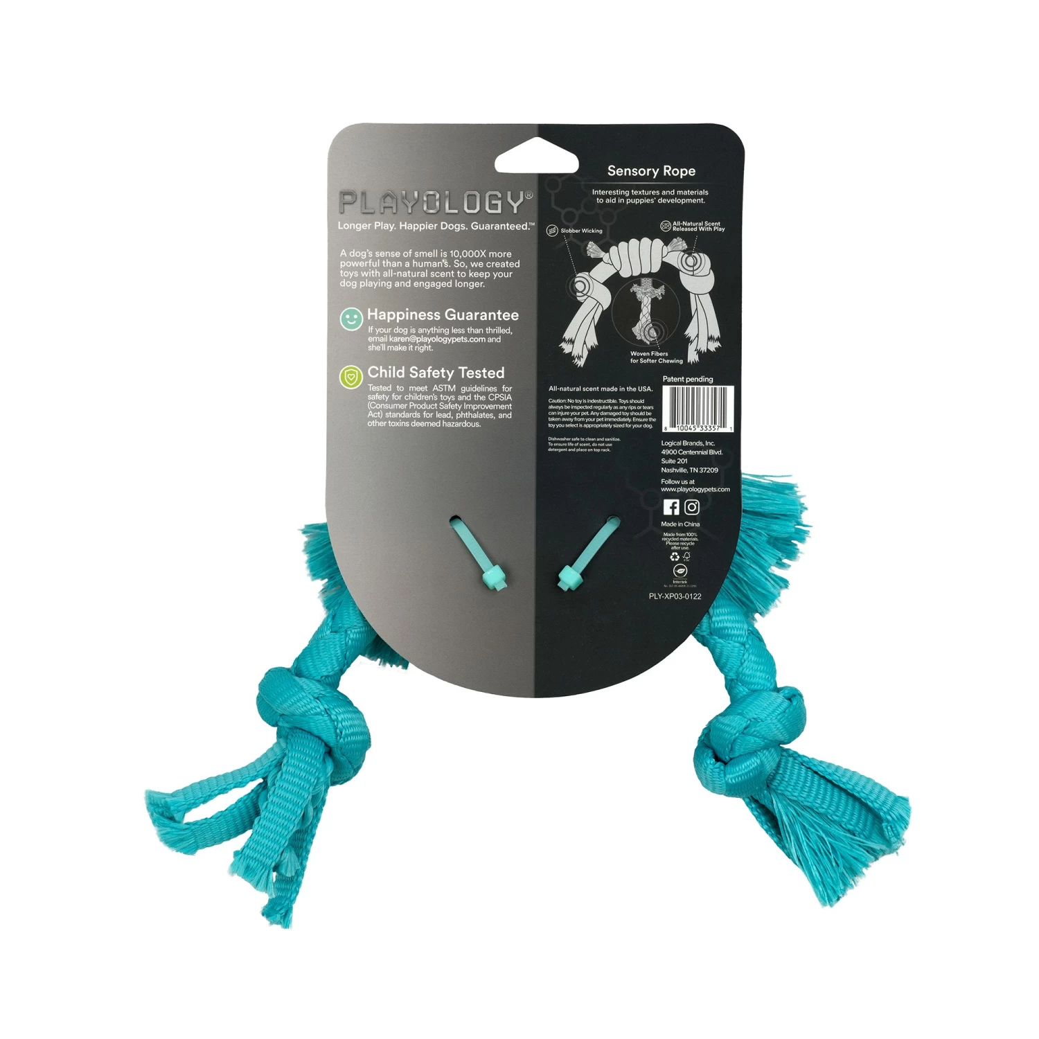 Your puppy will love the engaging all-natural chicken scent of this Playology Sensory Rope dog toy. Our puppy sensory toys are thoughtfully designed with unique textures and sounds that help with early sensory development. Made with maximum durability in mind and slobber-wicking fibers, this toy will keep your puppy engaged and playing longer than other rope toys.