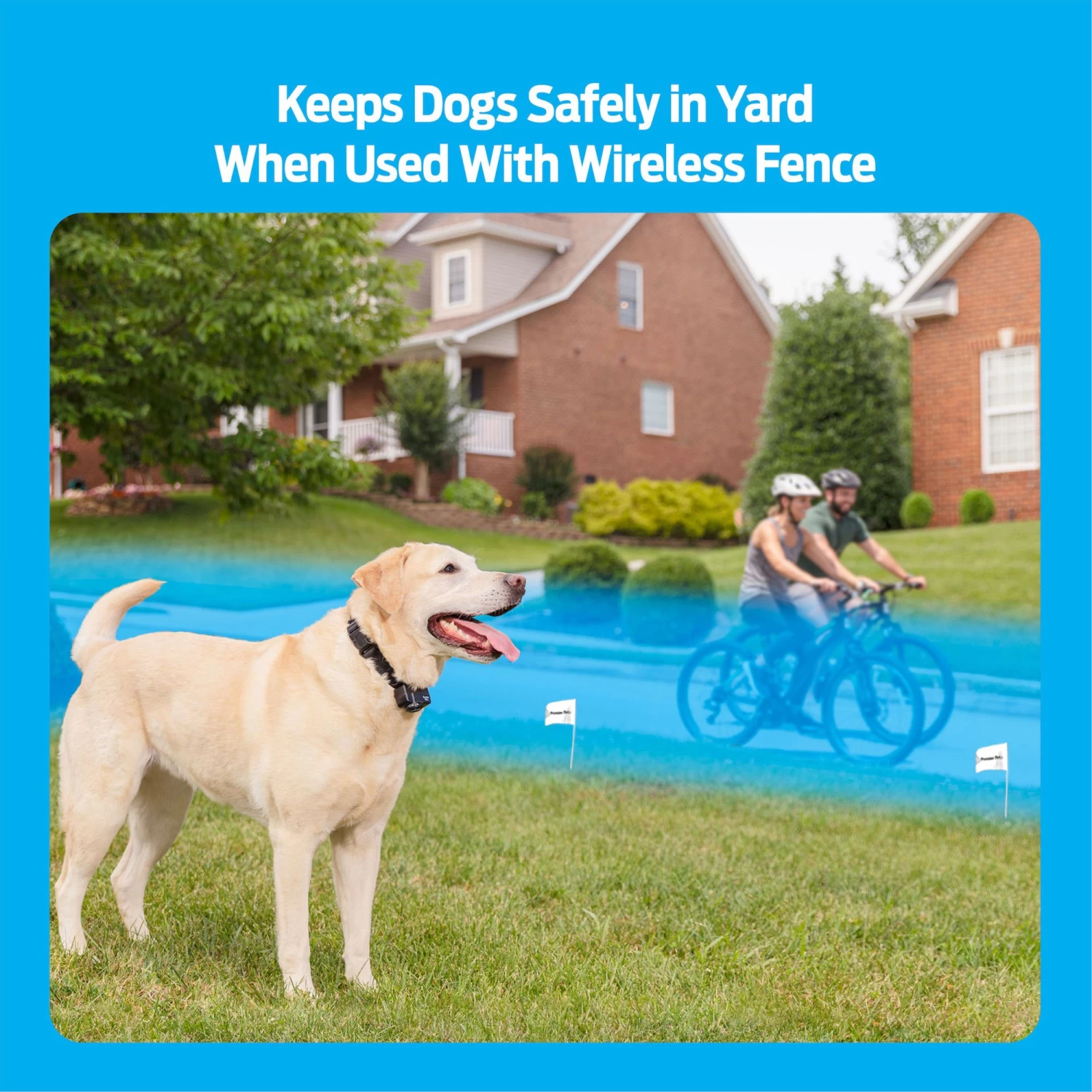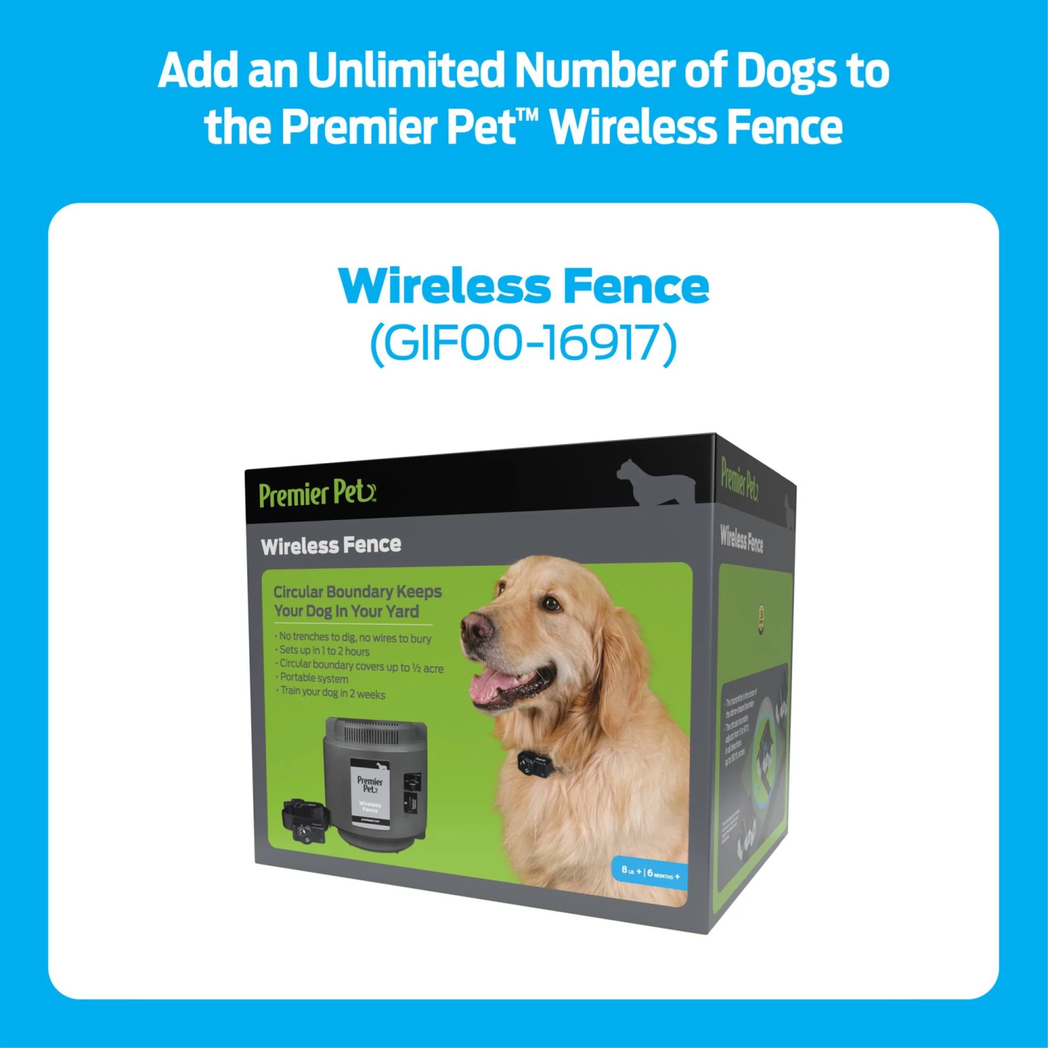 The Premier Pet Wireless Add-A-Dog collar allows you to expand your current Premier Pet Wireless Fence (GIF00-16917 or GIF00-16347) or the Guardian Wireless Fence to contain an unlimited number of dogs, or can be used as a replacement or extra receiver collar. When used with any of these wireless fence systems, a circular barrier keeps your dog safely in your yard. Coverage is adjustable up to 1/2 acre and is expandable for additional coverage area. This waterproof receiver collar is adjustable up to 27 inches, making it a great fit for both smaller and larger dogs. A low battery indicator on the collar will alert you when the collar battery (GAC11-16351) should be replaced. The collar has 1 level of tone only for training and 5 adjustable levels of static correction so that you are able to choose which level works best for your dog. A safety time-out feature will stop correcting after 30 seconds should your dog get outside of the boundary zone. Give all of your dogs freedom to play and yourself peace of mind with the Premier Pet Wireless Add-A-Dog!