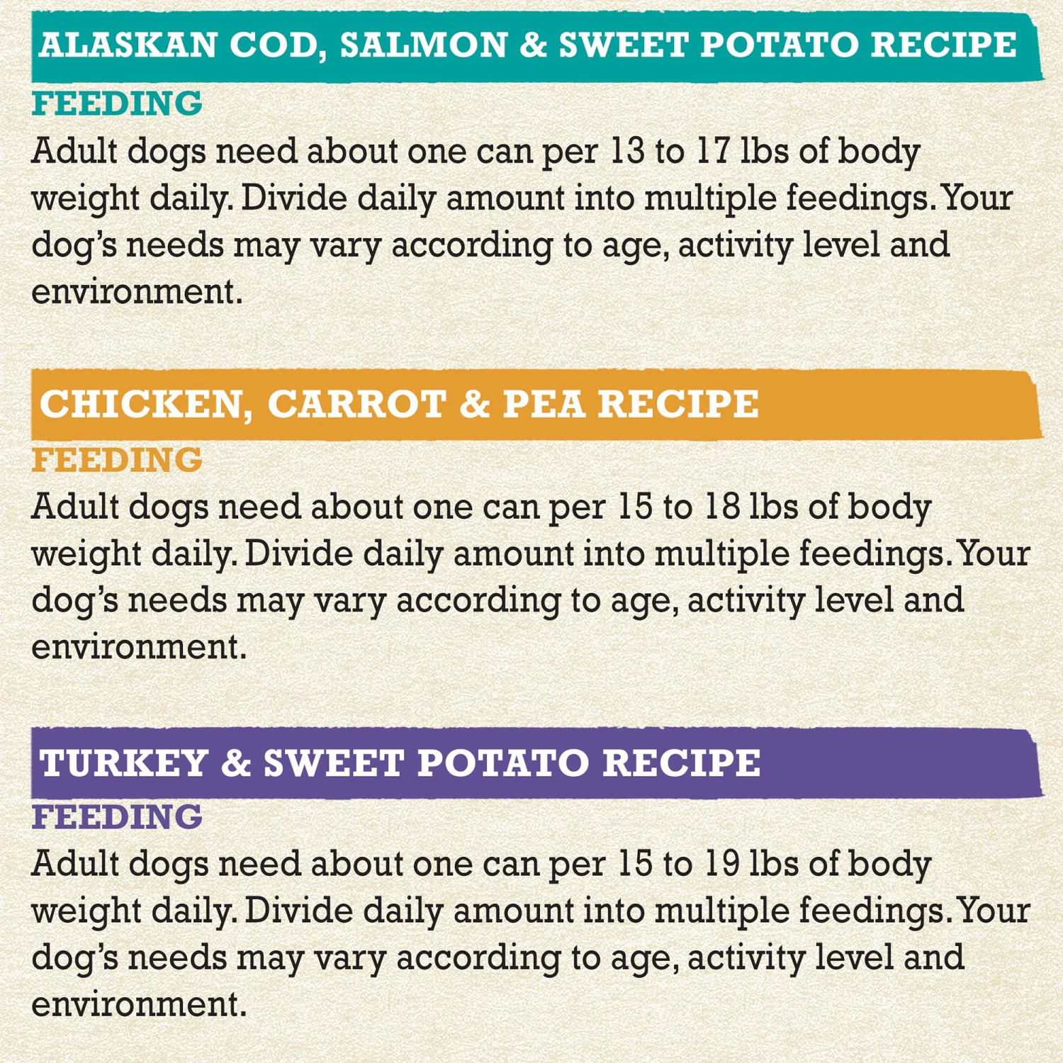 Adult dogs need about one can per 13 to 17 lbs. of body weight. Divide daily into multiple feedings. Your dog’s needs may vary according to age, activity level and environment.