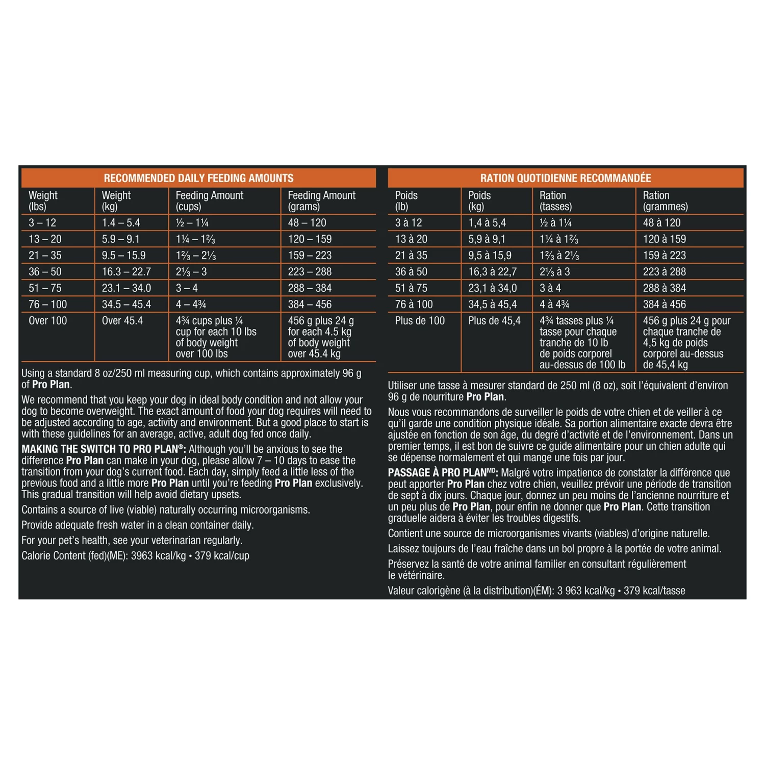 Although you’ll be anxious to see the difference Pro Plan can make in your dog, please allow 7-10 days to ease the transition from your dog’s current food. Each day, simply feed a little less of the previous food and a little more Pro Plan until you’re feeding Pro Plan exclusively. This gradual transition will help avoid dietary upsets. Contains a source of live (viable) naturally occurring microorganisms. Provide adequate fresh water in a clean container daily. For your pet’s health, see your veterinarian regularly.