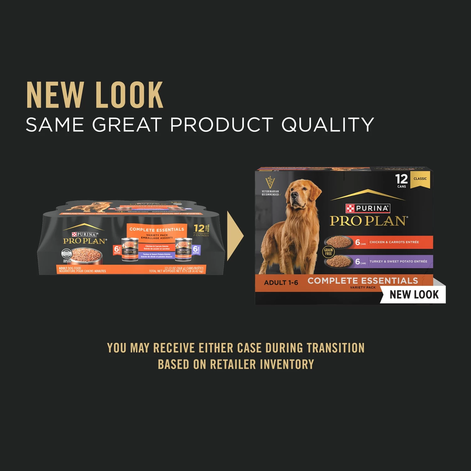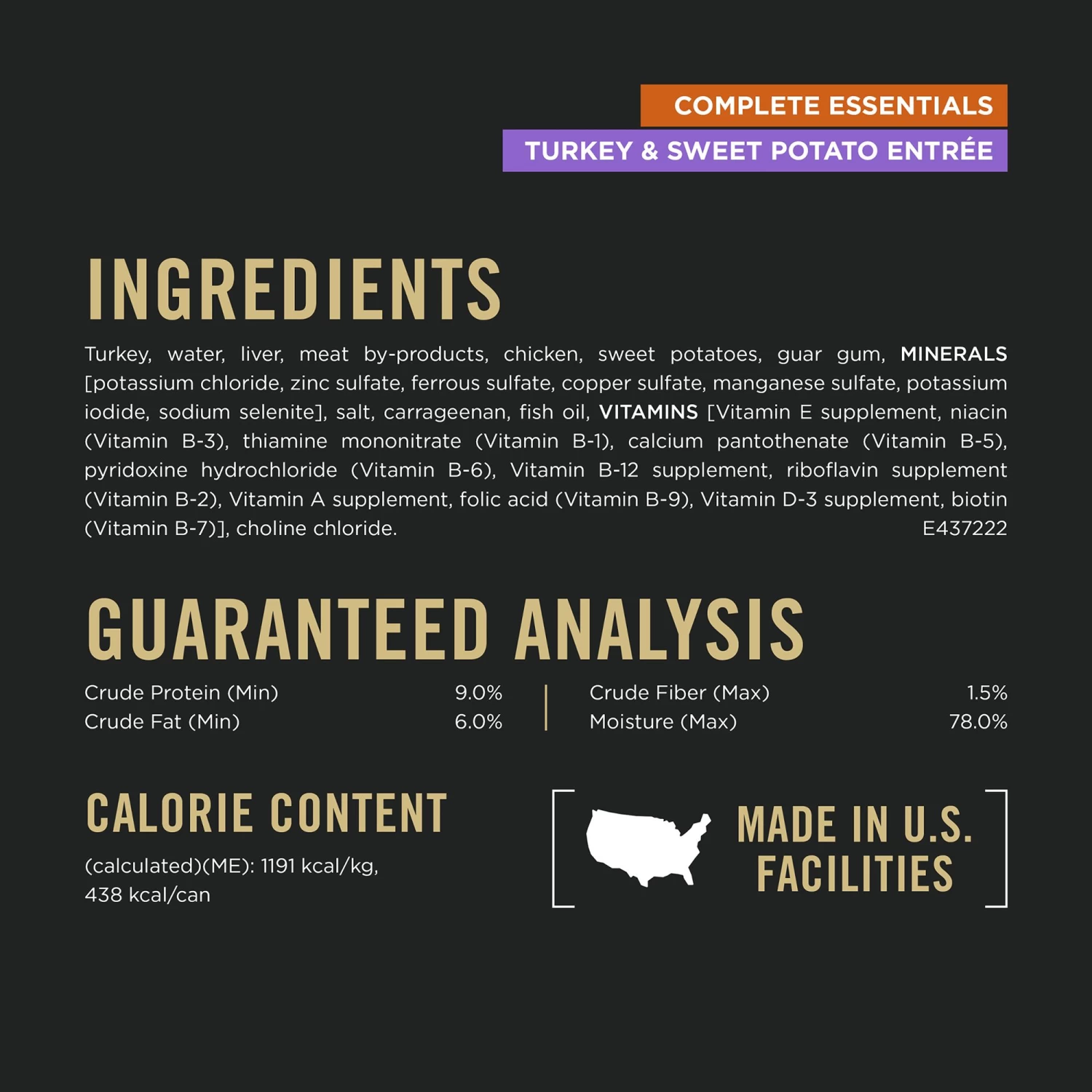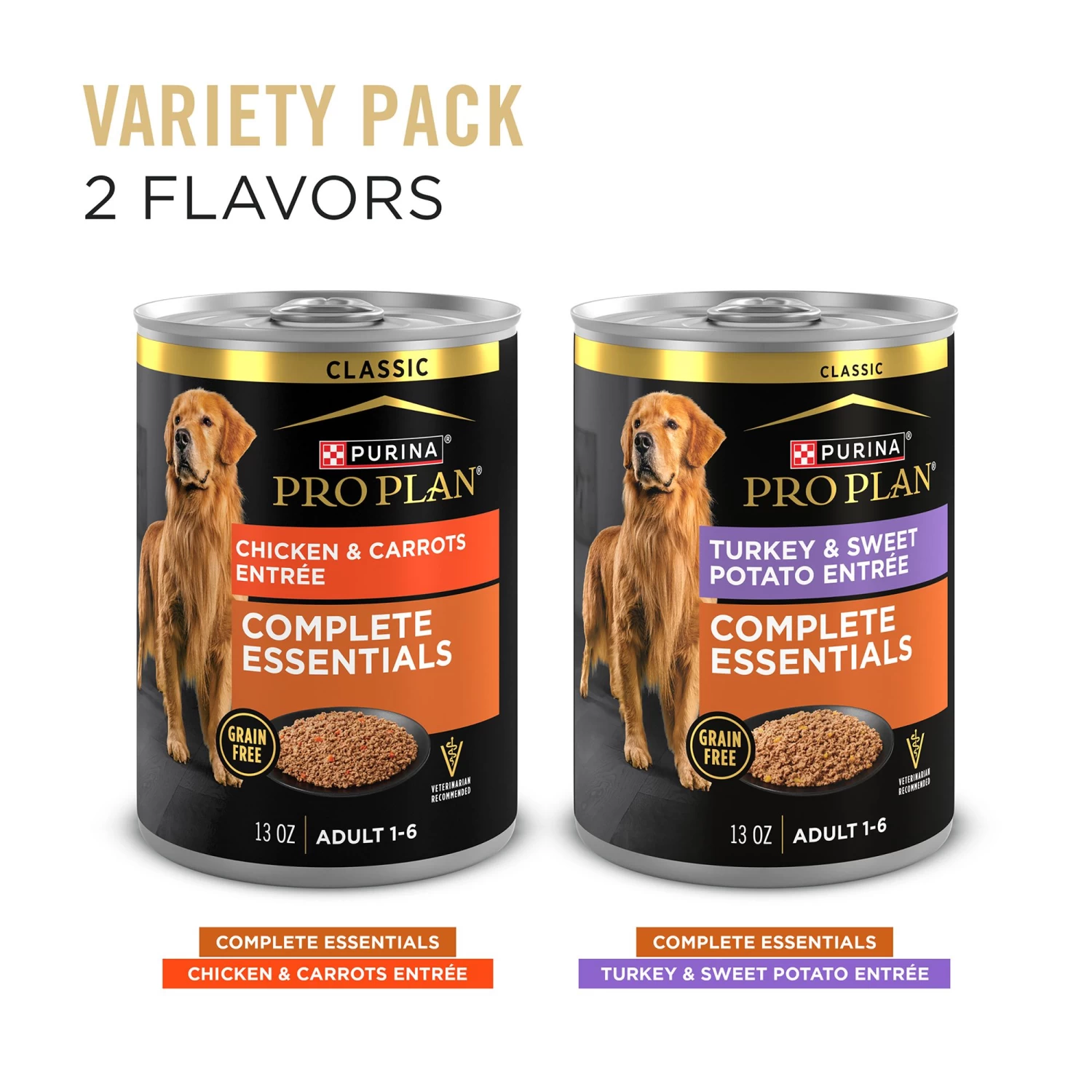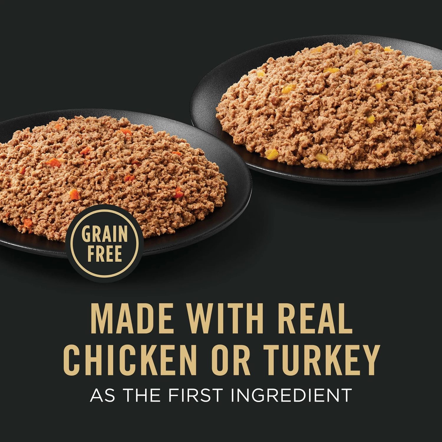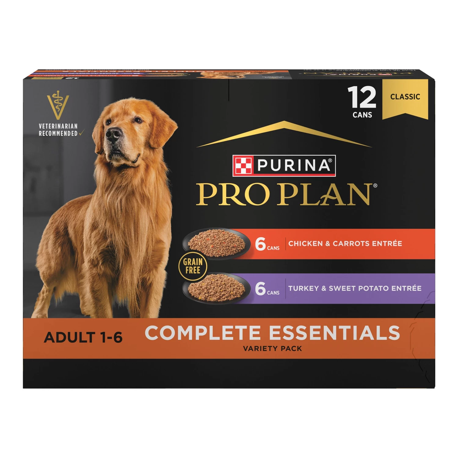 Let your dog choose between two equally delicious meal options with this Purina Pro Plan COMPLETE ESSENTIALS Grain Free adult wet dog food variety pack. Each entree features real chicken or turkey as the first ingredient for a taste dogs love, and both formulas offer high protein to help your dog maintain muscle mass. The tempting taste and moist, tender texture create a multisensory dining experience at mealtime. He gets the tastes and textures dogs love in every bowlful, along with 23 essential vitamins and minerals to help support his overall health and wellness. This premium dog food variety pack is made with no artificial colors, flavors or preservatives, so your adult dog gets the 100 percent complete and balanced nutrition you want without the ingredients you don’t. Each pate dog food loaf formula helps support his healthy immune system while nourishing your dog’s healthy skin and coat. Rotate between the two Purina Pro Plan COMPLETE ESSENTIALS grain free wet dog food entrees found in this collection at feeding time, and give your dog the nutrition he needs to be his best every day. We proudly manufacture our high protein grain free dog food at Purina-owned facilities and invite you to try it risk free.