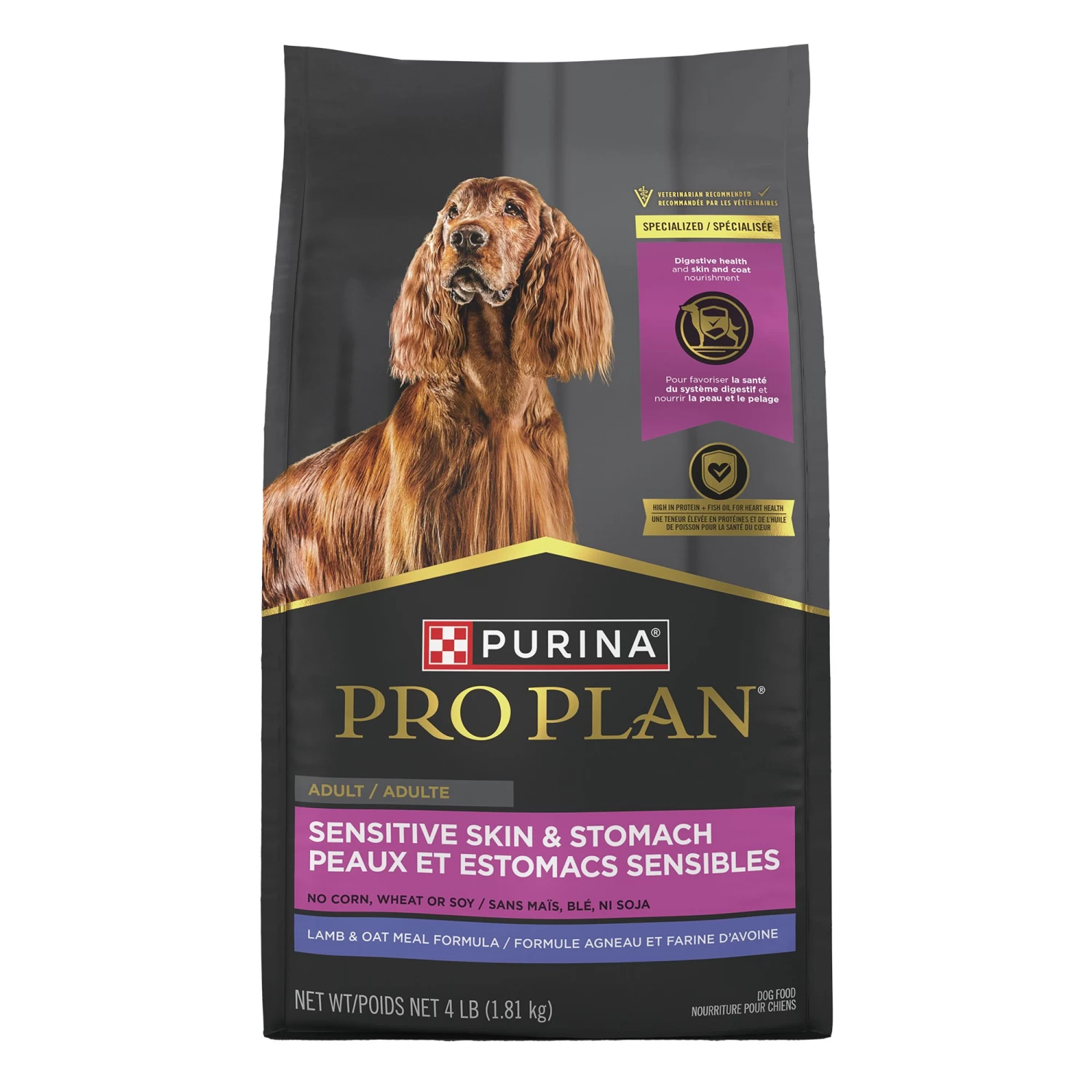 Care for your dog’s sensitive skin and stomach while still tending to his nutritional needs with Purina Pro Plan Brand Dog Food Sensitive Skin and Stomach Lamb and Oat Meal Formula adult dry dog food. This recipe is made without corn, wheat, soy or poultry by-product meal, giving your canine companion wholesome ingredients you expect from a super-premium dog food. Omega-6 fatty acids and zinc in every serving nourish your dog’s skin and promote his healthy coat so he can look his very best, and omega-3 fatty acids for healthy joints and mobility help to support his active lifestyle. With high-quality ingredients chosen for a specific nutritional or functional purpose, this dry dog food recipe delivers outstanding nutrition to your best buddy’s bowl every day. Make Purina Pro Plan dry dog food part of his regular diet, and show him just how important his overall health and wellness are to you.