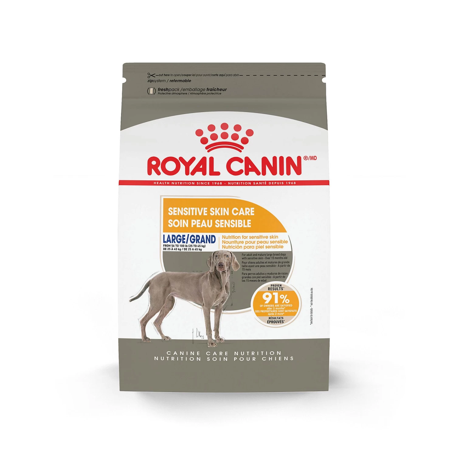 Royal Canin Large Sensitive Skin Care Dry Dog Food is tailored nutrition to support your adult dog’s sensitive skin and coat. Rich in omega-3 and -6 fatty acids, including EPA & DHA and GLA, this diet helps nourish dry skin and promotes a healthy coat. Plus, 91% of owners saw an improvement in their dog’s skin after two months while feeding Royal Canin Sensitive Skin Care exclusively. Mix this dry food with Royal Canin Sensitive Skin Care Wet Adult Dog Food for a variety of textures to please picky eaters. Also, remember to help protect your dog’s sensitive skin by keeping their bedding and favorite resting places clean.