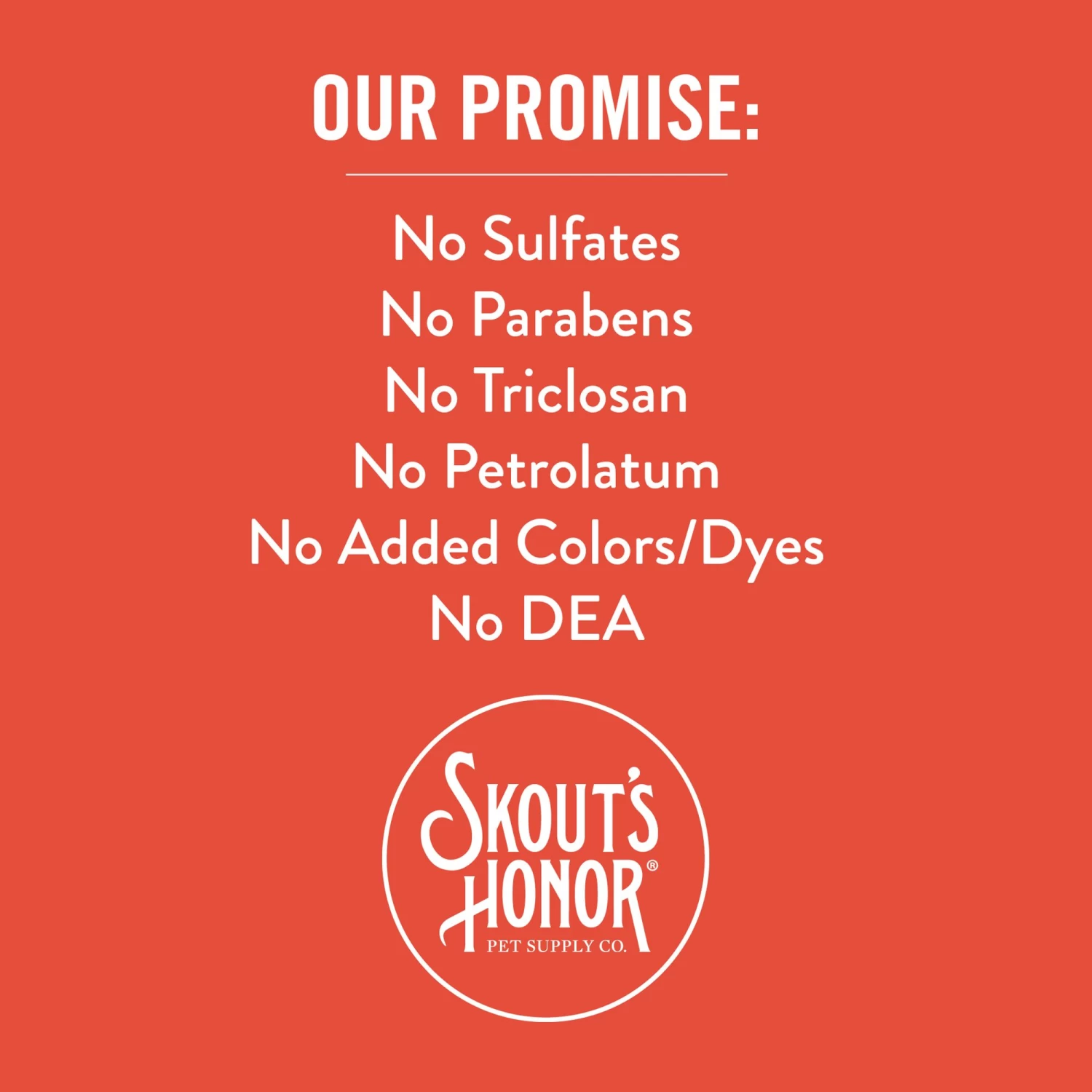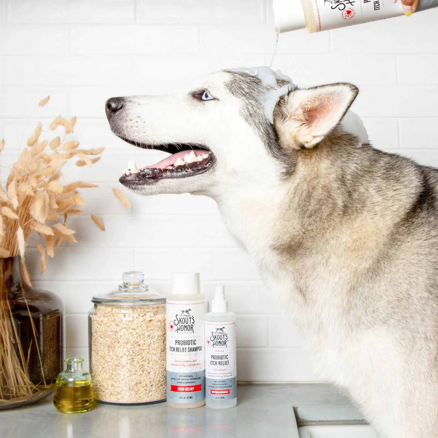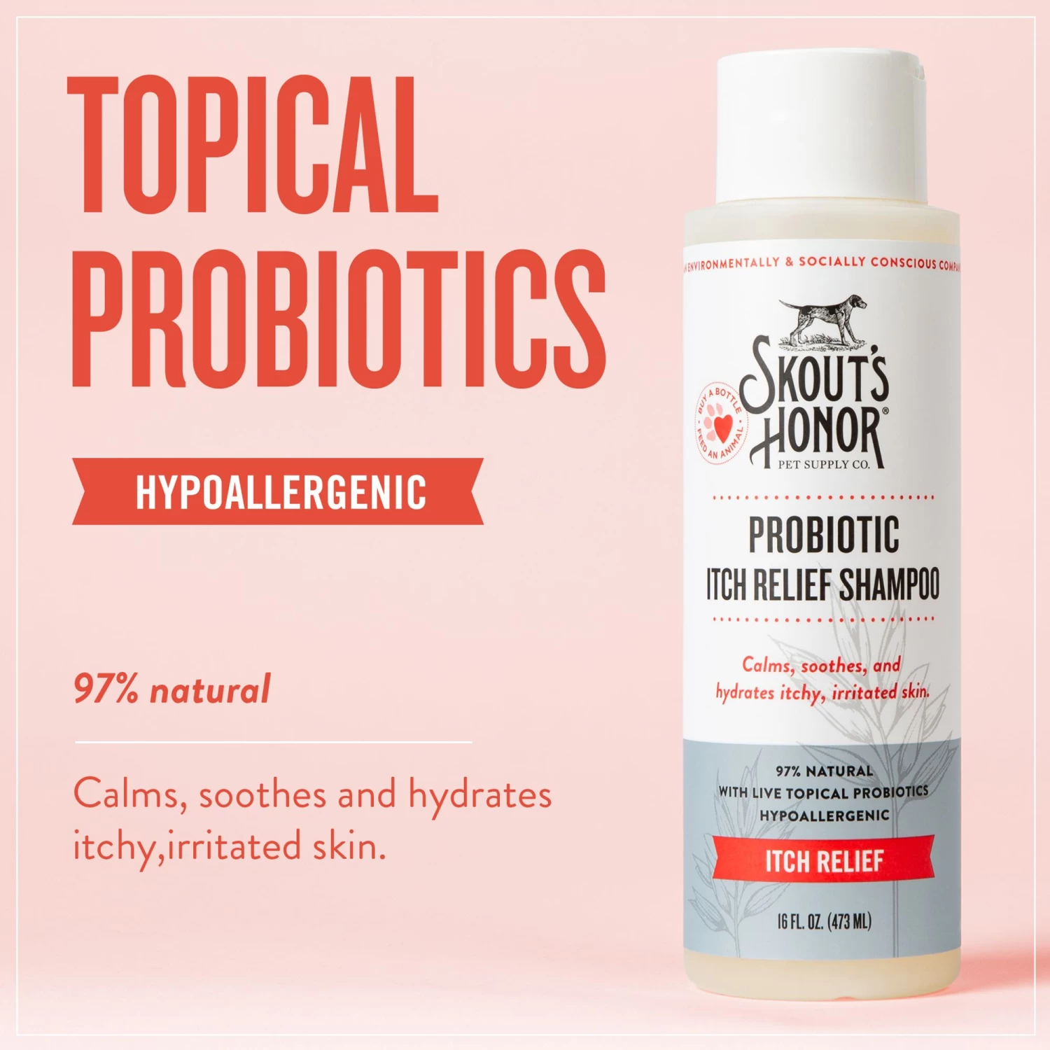 Skout’s Honor Probiotic Itch Relief Shampoo gently cleans and hydrates the skin and coat, leaving fur silky and smooth. Offers comfort and long-lasting relief for pets who suffer from chronic skin irritations. It contains live topical probiotics that help support a healthy microbiome to defend against common skin problems such as itching, odor, dryness, dandruff, hot spots, yeast and excessive shedding.At Skout’s Honor, our goal is simple: curate the best technologies and create products that greatly improve the experience of living with and loving our pets. Skout’s Paw Pledge: Together we provide a day’s worth of food to an animal in need with every purchase (Buy a Bottle, Feed an Animal). We are environmentally and socially conscious. Our products exceed the highest level of environmental responsibility and safety standards and perform above and beyond anything else in their category.
