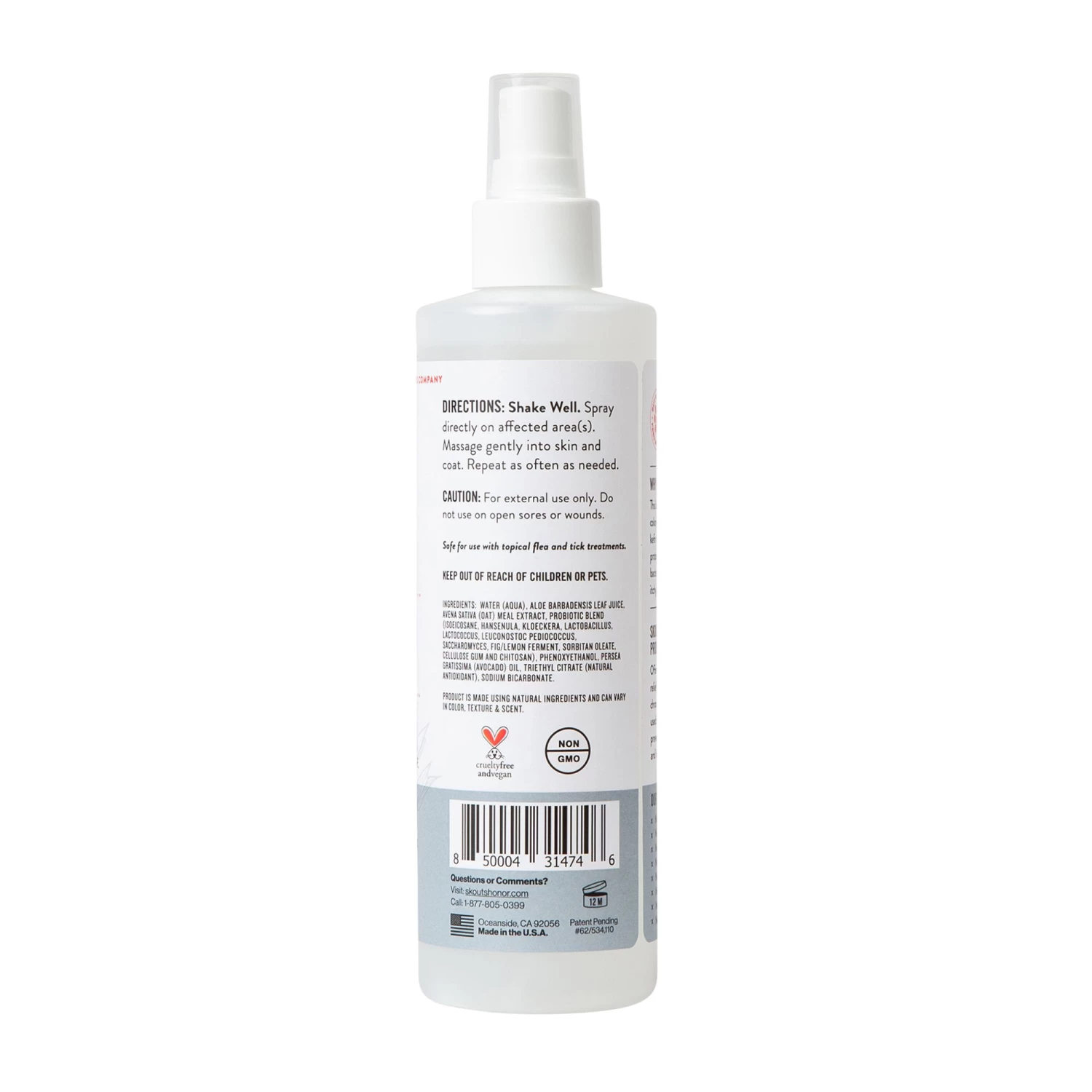 Skout’s Honor Probiotic Itch Relief Spray offers comfort and long-lasting relief for pets who suffer from chronic skin irritations. May be used as needed or as a daily preventative spray for a happier and healthier-looking pet! It contains topical probiotics that help support a healthy microbiome to defend against common skin problems such as itching, odor, dryness, dandruff, hot spots, yeast and excessive shedding. At Skout’s Honor, our goal is simple: curate the best technologies and create products that greatly improve the experience of living with and loving our pets. Skout’s Paw Pledge: Together we provide a day’s worth of food to an animal in need with every purchase (Buy a Bottle, Feed an Animal). We are environmentally and socially conscious. Our products exceed the highest level of environmental responsibility and safety standards and perform above and beyond anything else in their category.