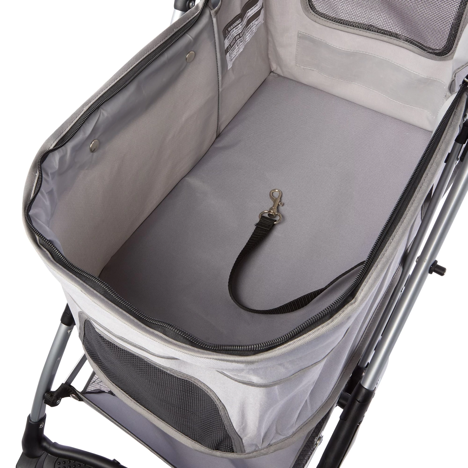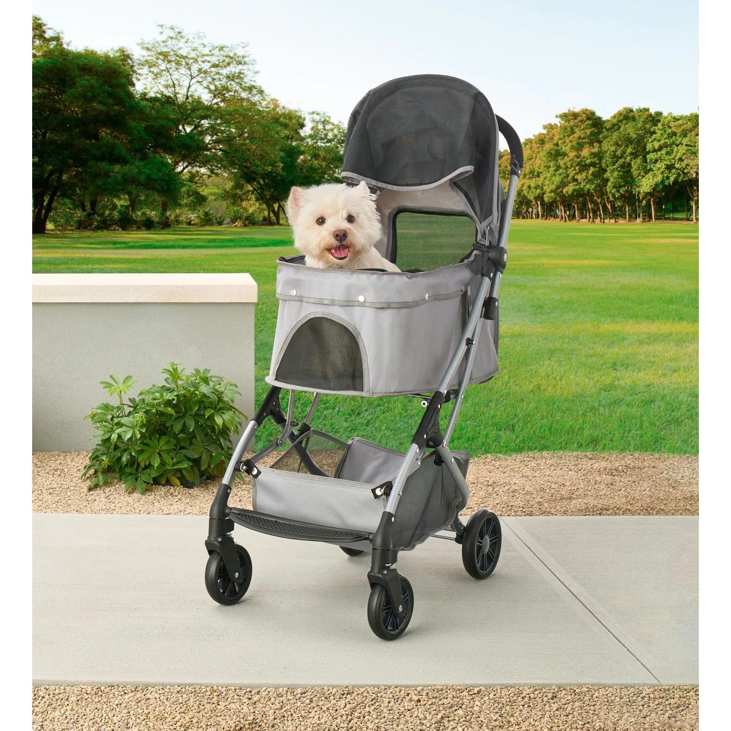 This Top 4-Wheel pet Stroller allows you to travel with your dog in crowded, urban environments. The design of this stroller allows for zero friction and a smooth, stable 4-wheel ride. With features such as a breathable carriage, spacious storage, and a compact quick fold, traveling is a breeze. Only at PetSmart.