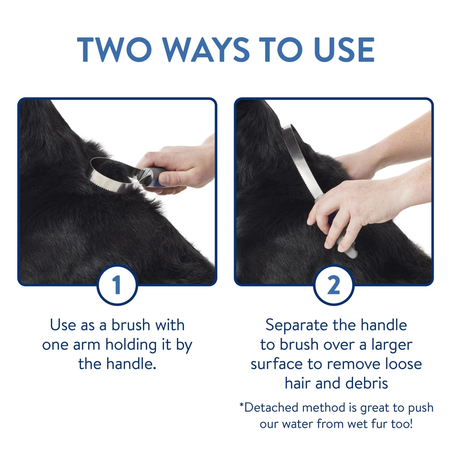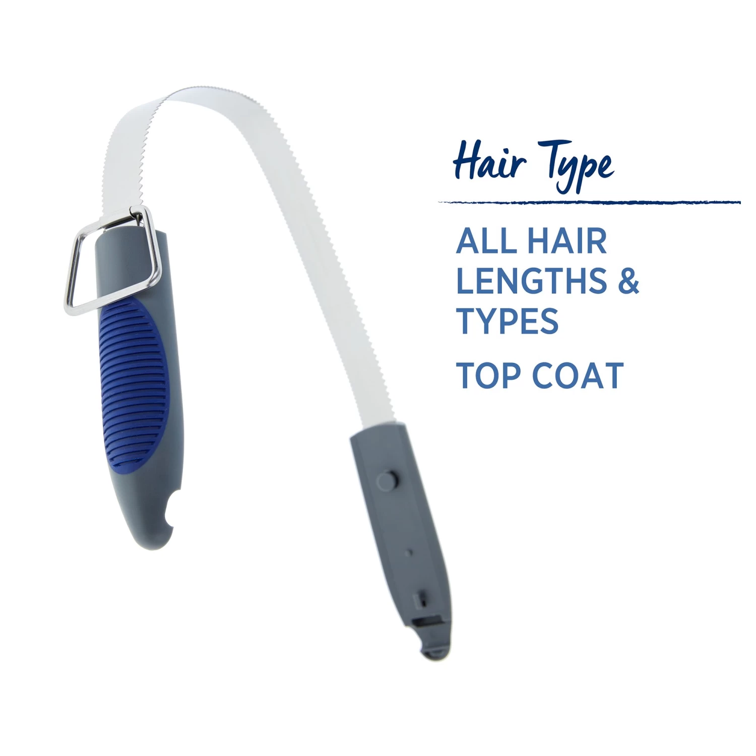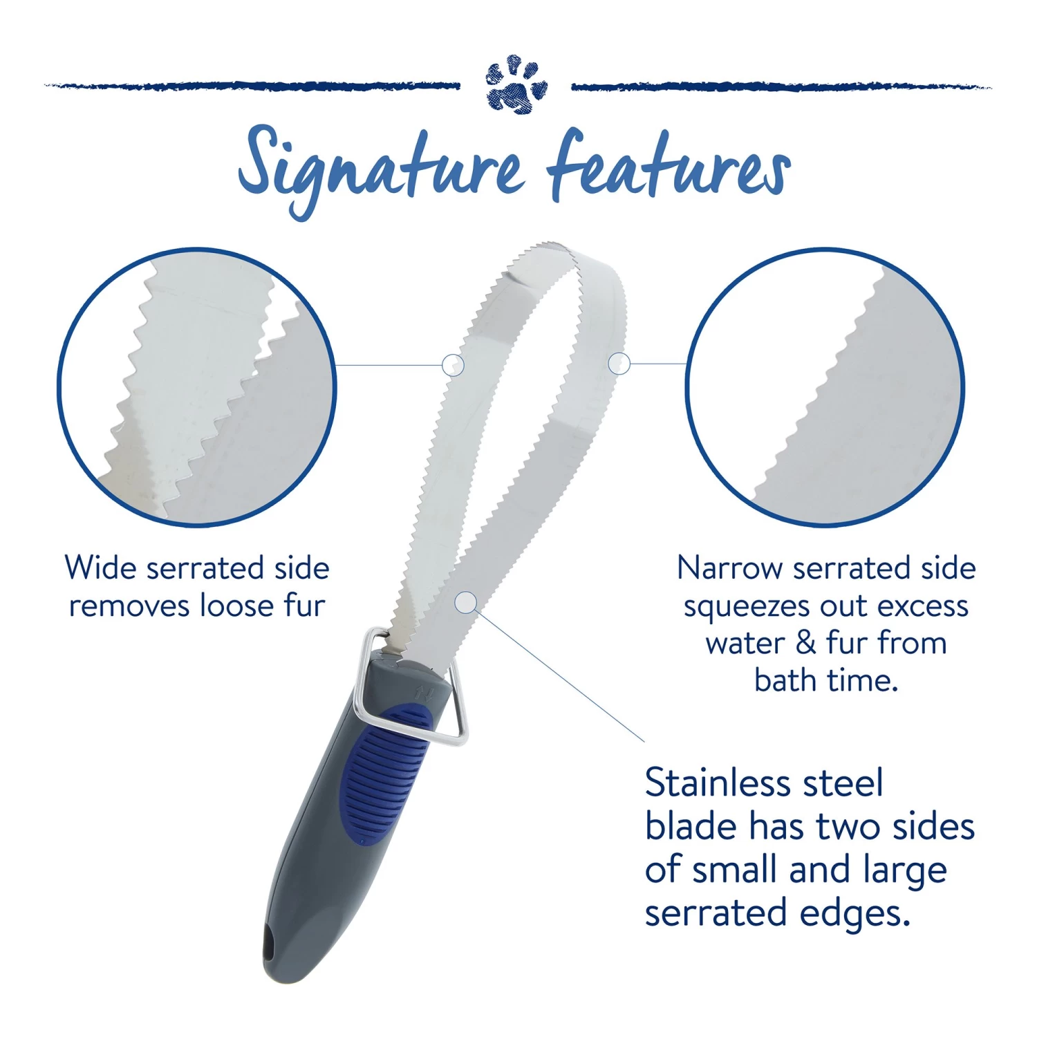 Those with dogs who shed will love having access to this Top Paw Shedding Blade. This blade features a narrow serrated side that squeezes our excess water and fur from bath time, along with a wide serrated side that removes loose fur. Only at PetSmart.