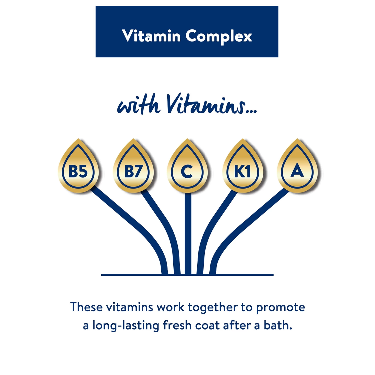in one step, while oatmeal gently nourishes your dog’s skin. This unique formulation includes a special vitamin complex blend of nutrients that helps maintain the health of your dog’s coat and