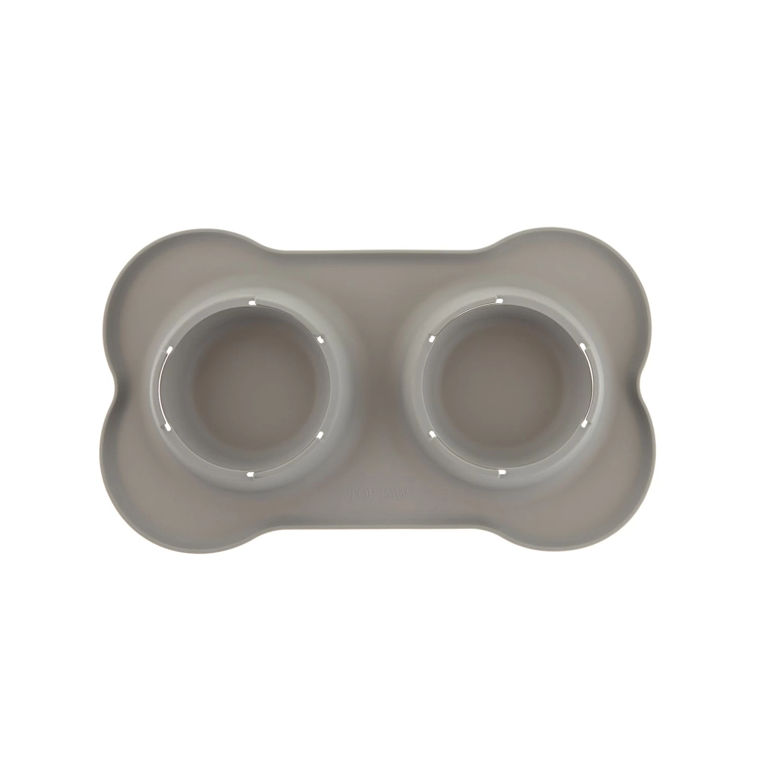Give your dog easy access to food or water, and keep spilled food and water off of your floor, with this Top Paw Gray Silicone Double Dog Bowl with Mat. This fun bone-shaped mat features two bowl holders to keep the two included bowls firmly in place. If food or water does, spill, the silicone mat’s raised edges will keep them off of your floor.. Only at PetSmart.