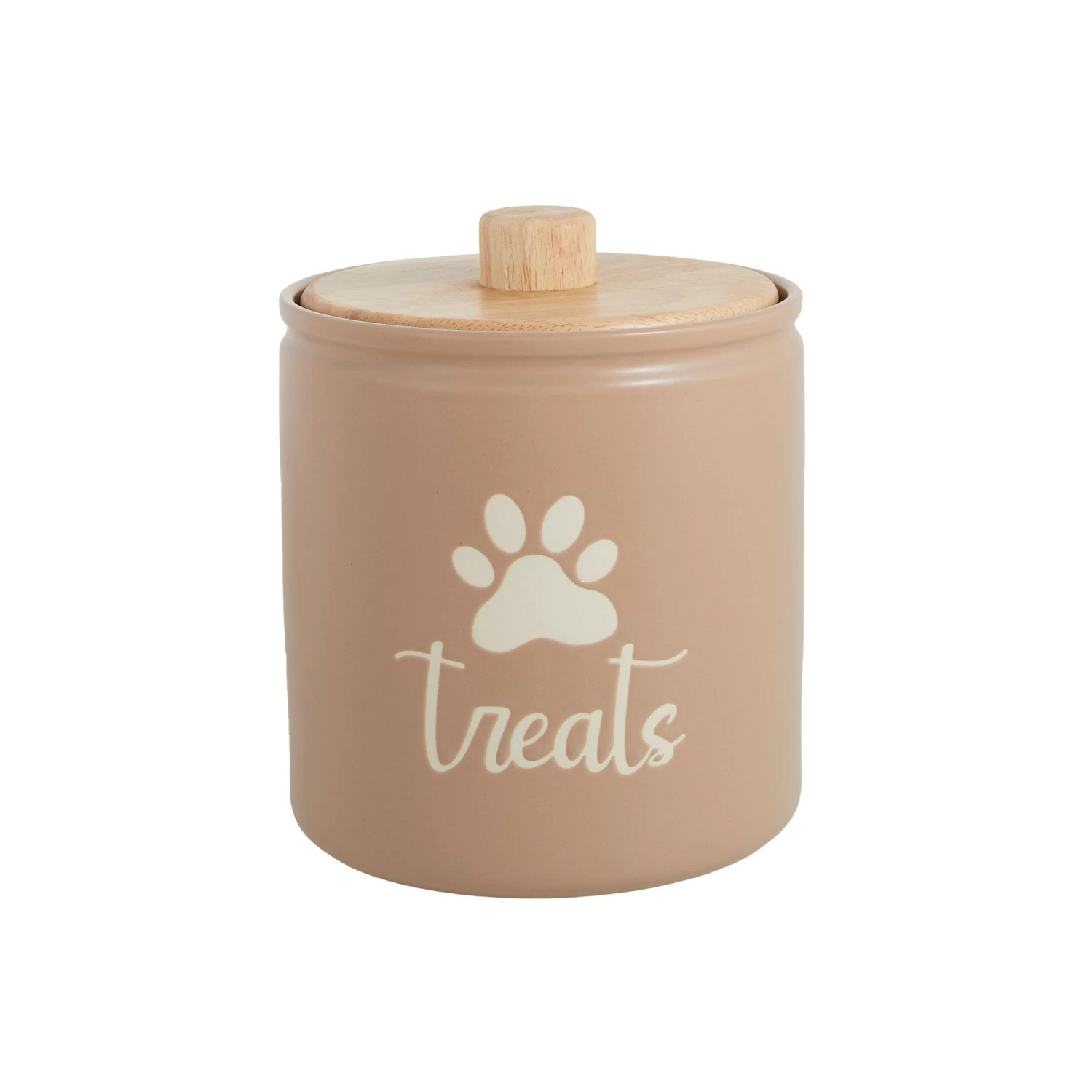 keep your dog’s treats fresh and in one place: namely this Top Paw Tan Paw Print Treat Jar. This great-looking jar features a stylish bone print design. Strong and sturdy, it comes with a removable wooden top that helps to keep the treat inside in a state of optimal freshness. Only at PetSmart.