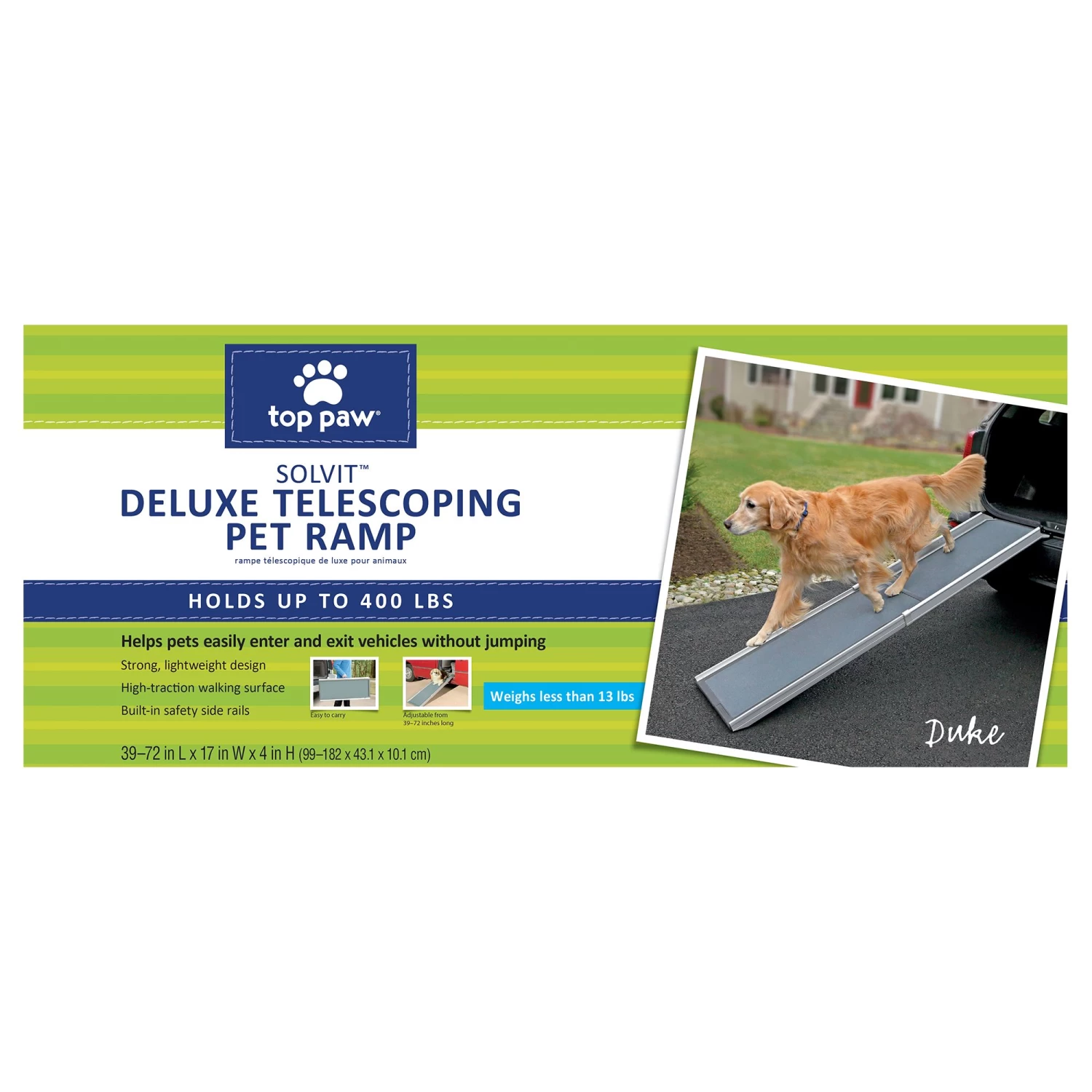 The Top Paw Deluxe Telescoping Pet Ramp is a versatile and easy-to-carry pet ramp that is ideal for older pets who have difficulty getting into cars or climbing stairs. This easy-to-use ramp opens and closes in seconds, and features telescopic, adjustable length. Use it also to help your pet(s) to reach beds, exam tables, or get into grooming tubs. Only at PetSmart.
