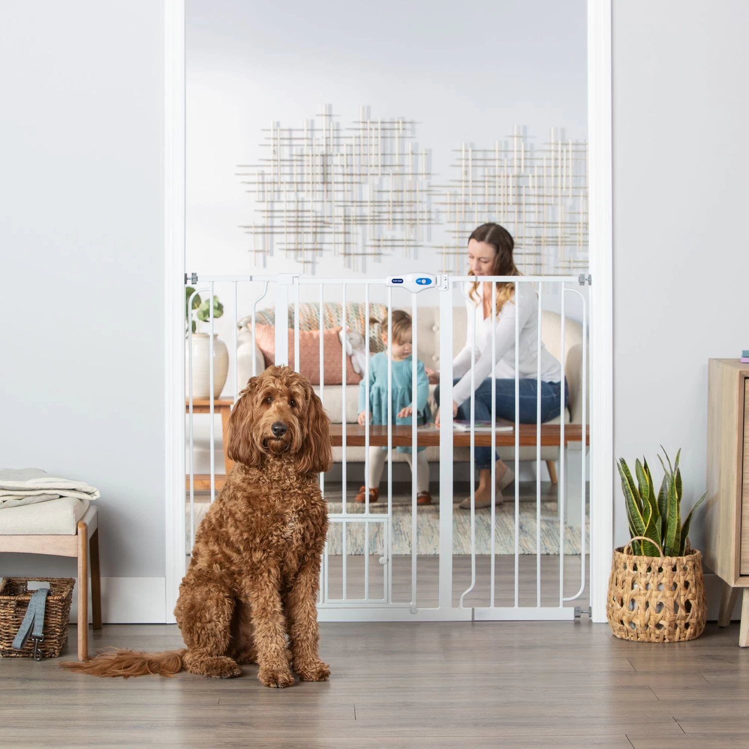 This Top Paw Extra-Tall Walk-Through Pet Gate helps create a barrier for your dog within your office or home. Simply wedge against a doorframe or wall, and use this walk-through pet gate to section off an area for them to comfortably play and roam. Only at PetSmart.
