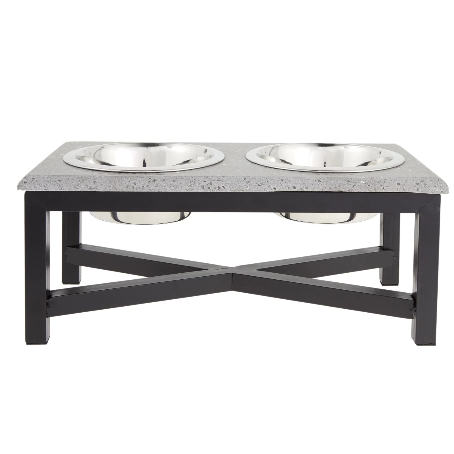 This Top Paw Grey Stone Top Metal Leg Stand with Double Dog Bowls is the perfect choice to keep your pup fed and watered. This great-looking elevated stand is made of stone with metal legs, and comes with two bowls for food and water. Elevated dog bowls make for better digestion, and this stylish stand will look great sitting in place. Only at PetSmart.