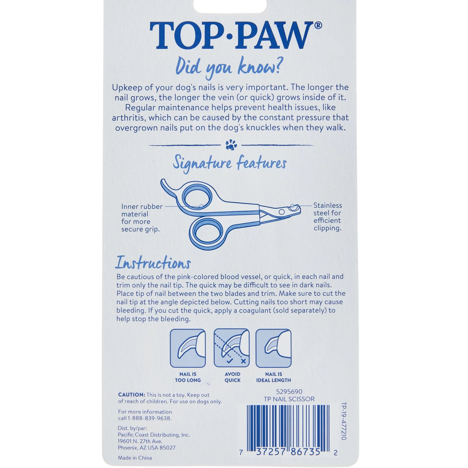 Instructions: Be cautious of the pink-colored blood vessel, or quick, in each nail and trim only the nail tip. The quick may be difficult to see in dark nails. Place tip of nail in clipper and push handles together. Make sure to cut nail tip at the angle depicted below. Cutting nails too short may cause bleeding. If you cut the quick, apply a coagulant (sold separately) to help stop the bleeding.