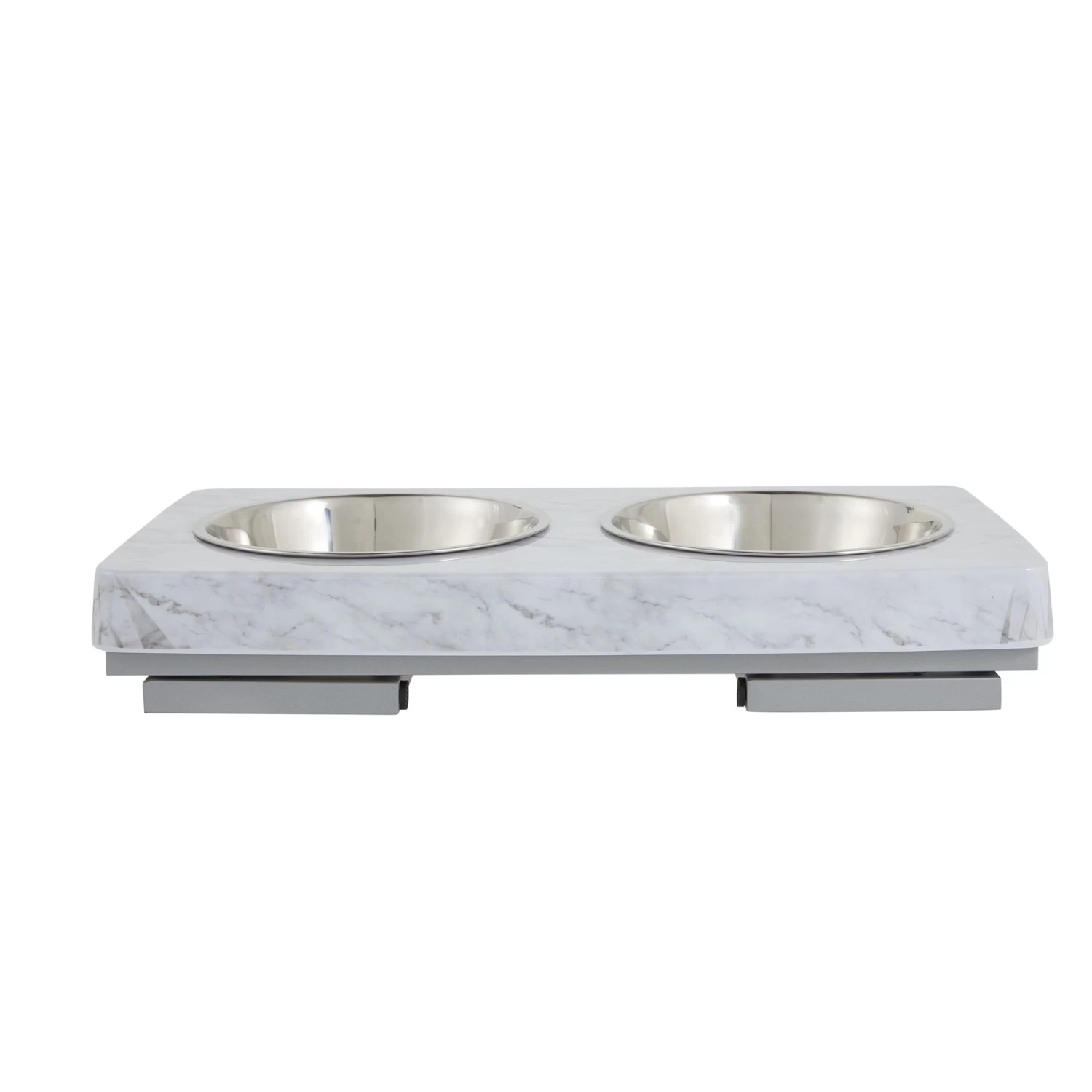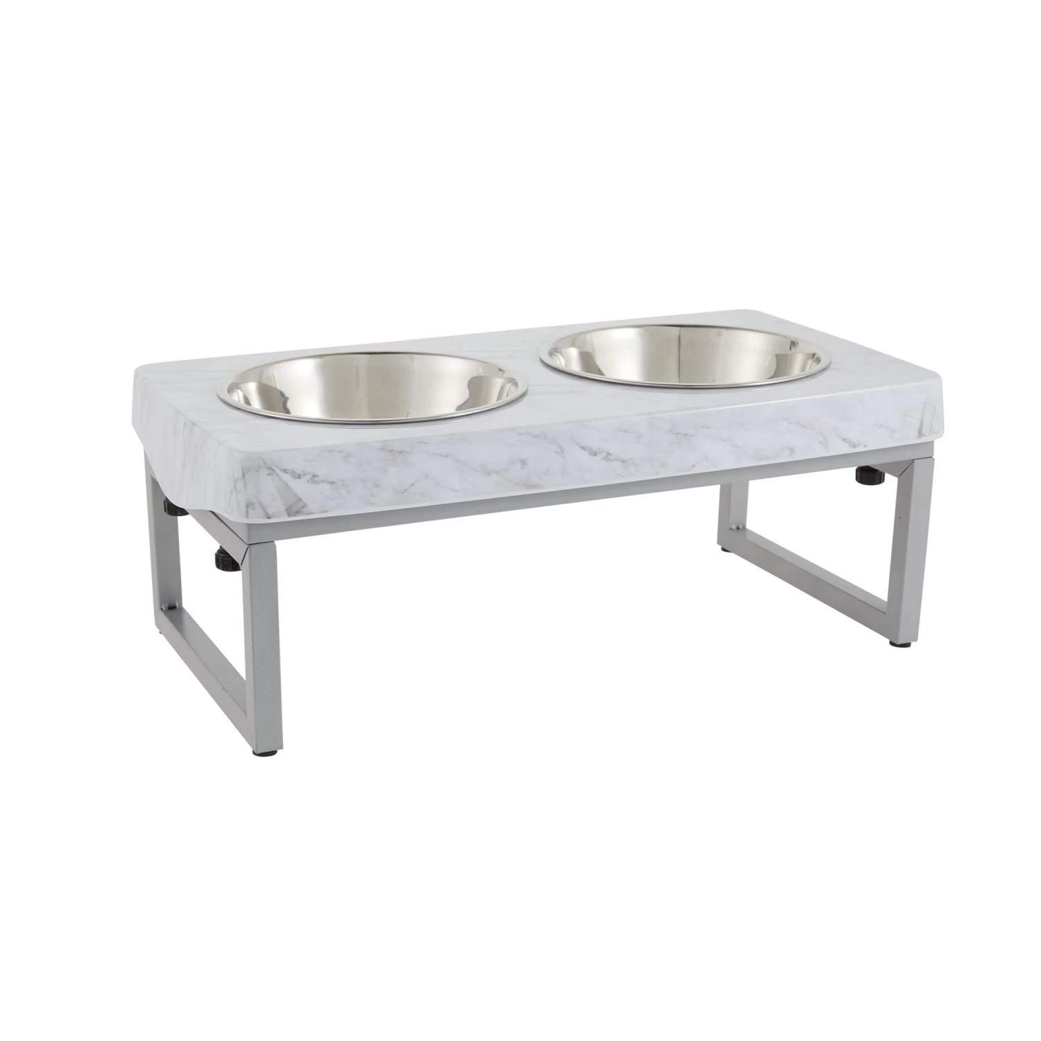 This Top Paw White Marble Double Dog Bowl Elevated Feeder allows your dog to eat and drink in healthier fashion. This feeder features two bowls and comes with legs that fold down, making it easy to store or to take with you when you travel. Eating from a raised bowl helps support proper swallowing and healthy digestion. It can also relieve stress on your dog’s shoulders and neck, making this elevated feeder a wise choice. Only at PetSmart.