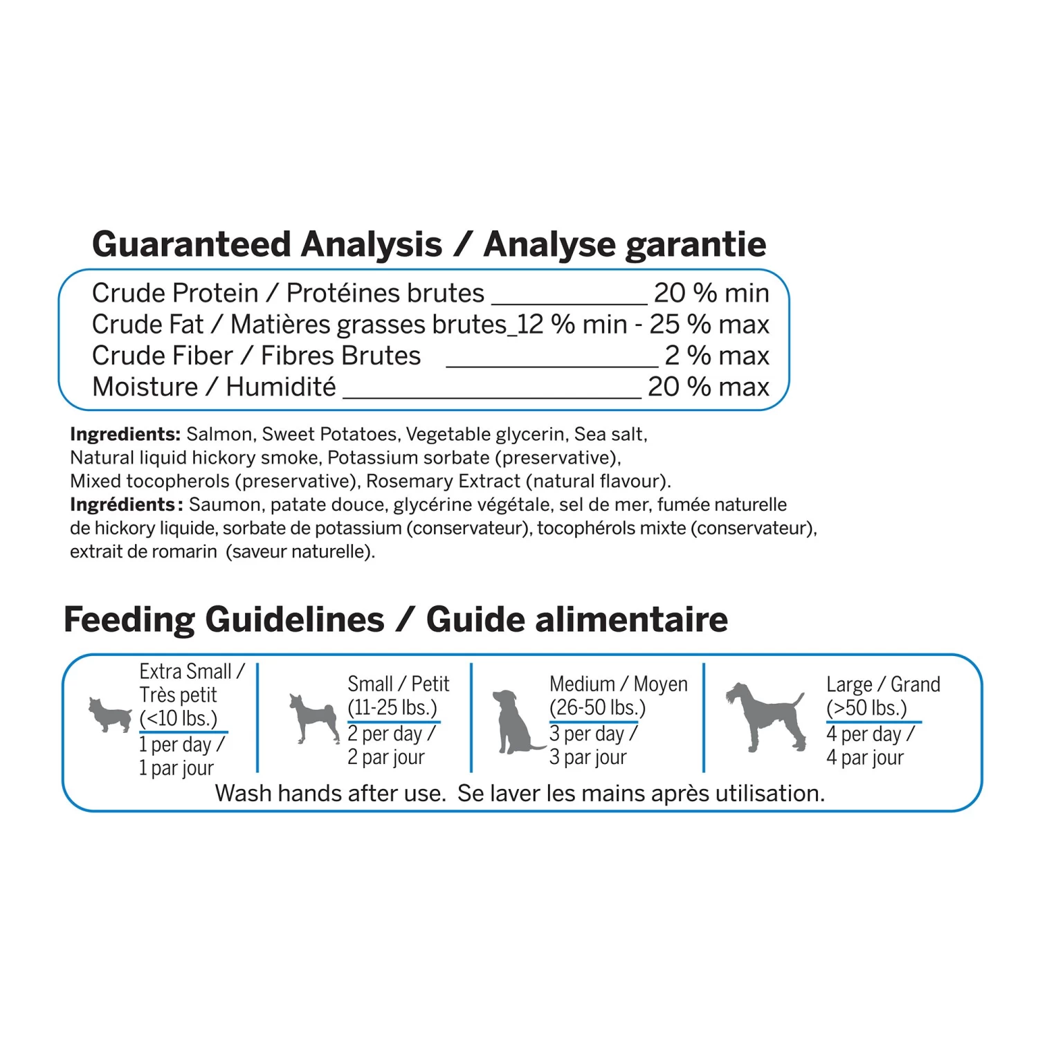 Salmon, Sweet Potatoes, Vegetable Glycerin, Sea Salt, Natural Liquid Smoke, Potassium Sorbate, Mixed Tocopherols, Rosemary Extract (Natural Flavour)