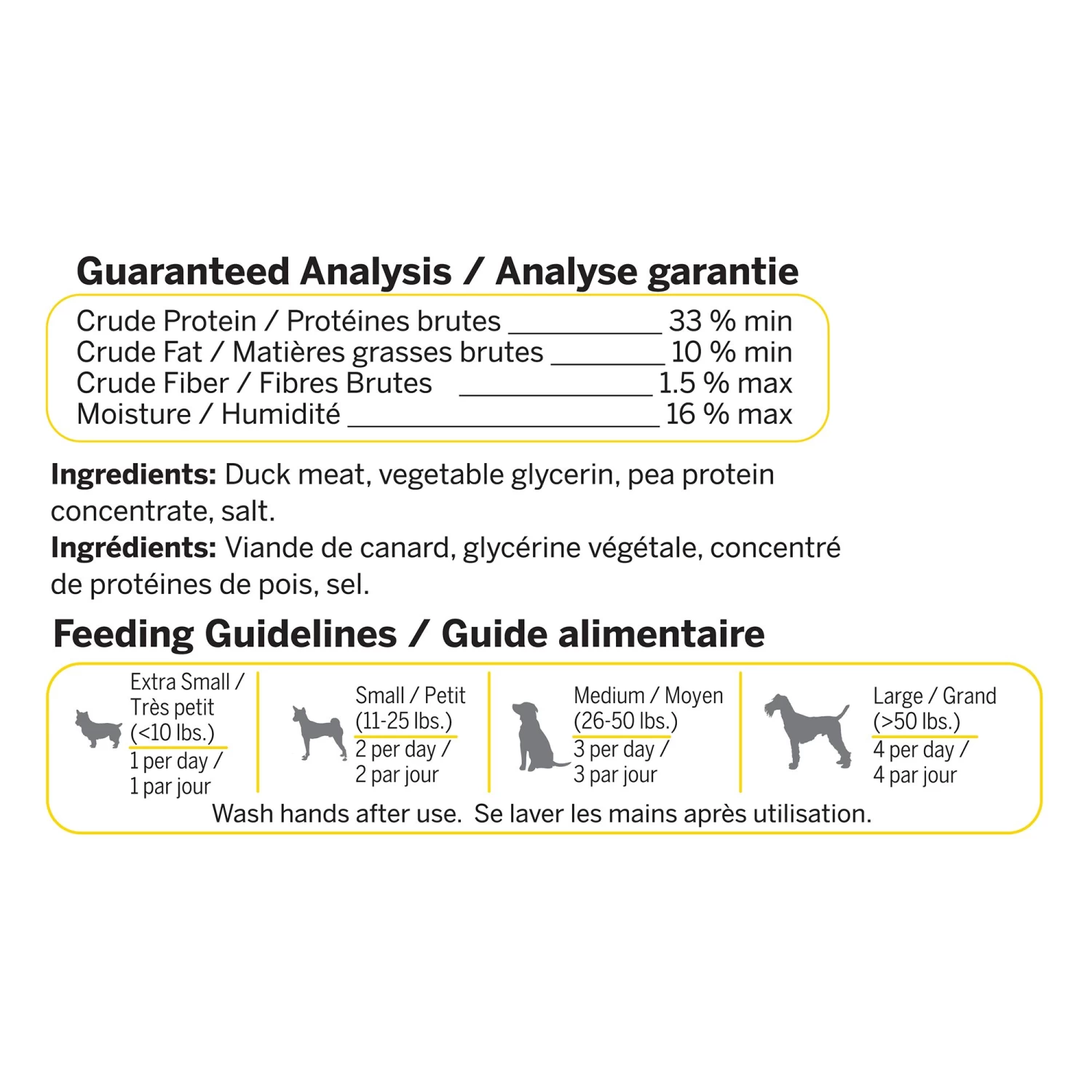 Duck Meat, Vegetable Glycerin, Pea Protein Concentrate, Salt