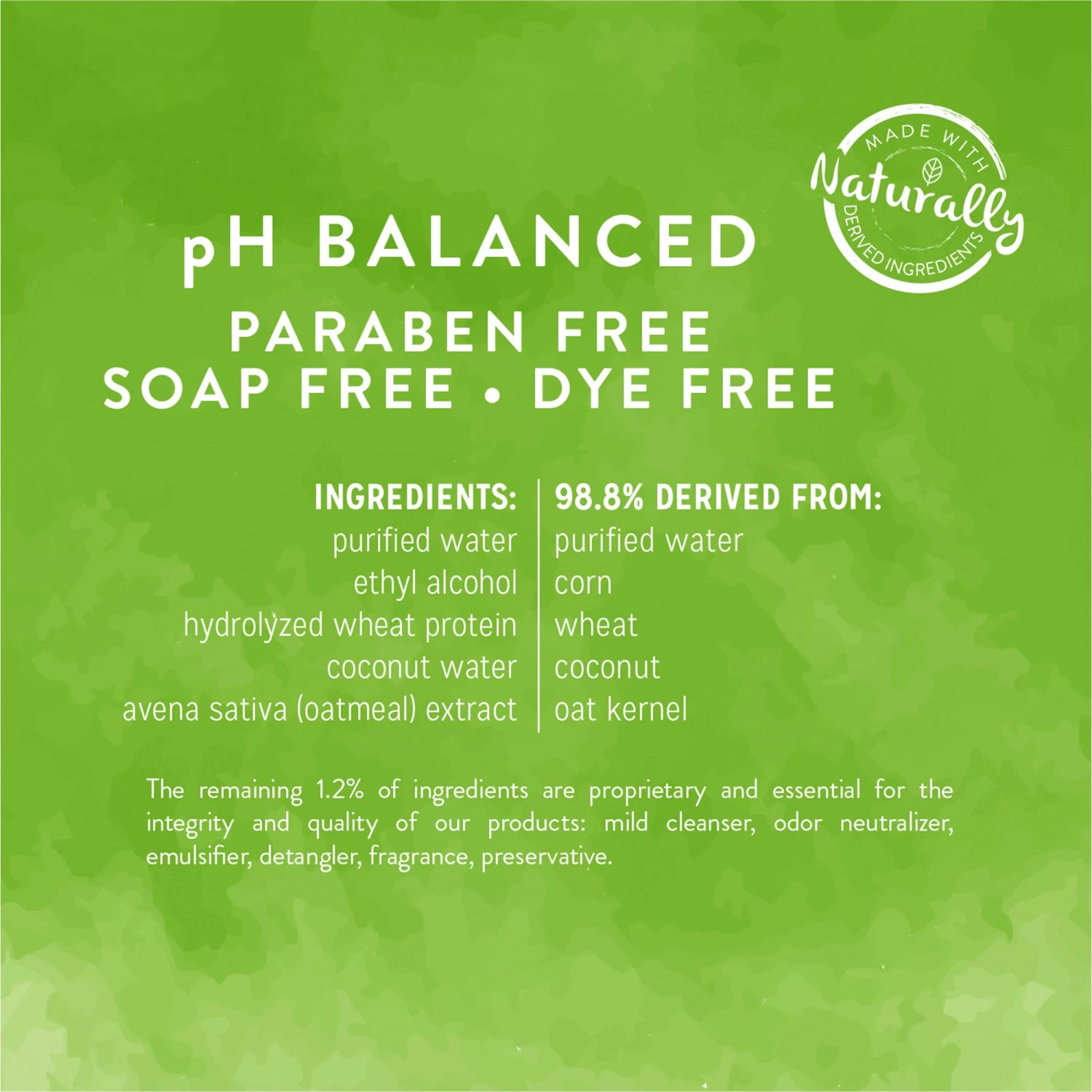 Purified Water, Mild Cleanser, Odor Neutralizer, Organic Extracts of Oatmeal and Cucumber
