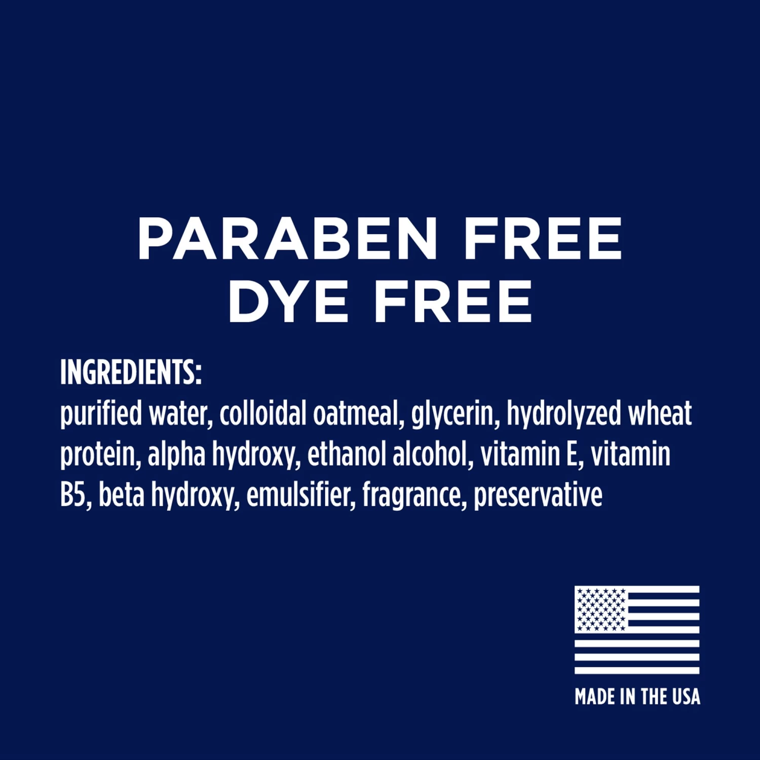 Ingredients: Purified Water, Colloidal Oatmeal, Glycerin, Hydrolyzed Wheat Protein, AlphaHydroxy, Ethanol Alcohol, Vitamin E, Vitamin B5, Beta Hydroxy, Emulsifier, Fragrance, Preservative