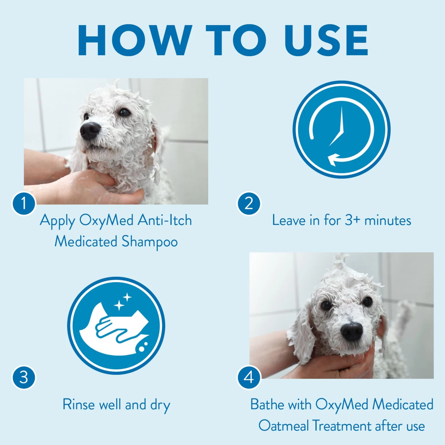SHAKE WELL BEFORE EACH USE. Wet the pet’s coat, then apply a generous amount of OxyMed Medicated Oatmeal Shampoo to the entire pet, massaging into a rich lather. Leave in for 3+ minutes then rinse well and dry. Repeat as necessary. For best results, bathe your pet with OxyMed Medicated Oatmeal Treatment after use.