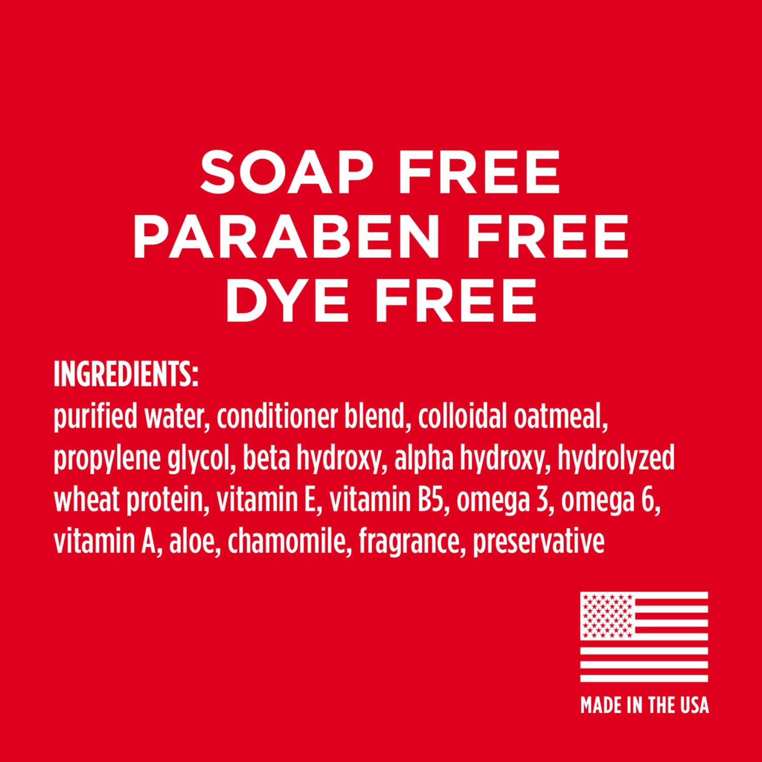 Purified Water, Conditioner Blend, Colloidal Oatmeal, Propylene Glycol, Beta Hydroxy, Alpha Hydroxy, Hydrolyzed Wheat Protein, Vitamin E, Vitamin B5, Omega 3, Omega 6, Vitamin A, Aloe, Chamomile, Fragrance, Preservative