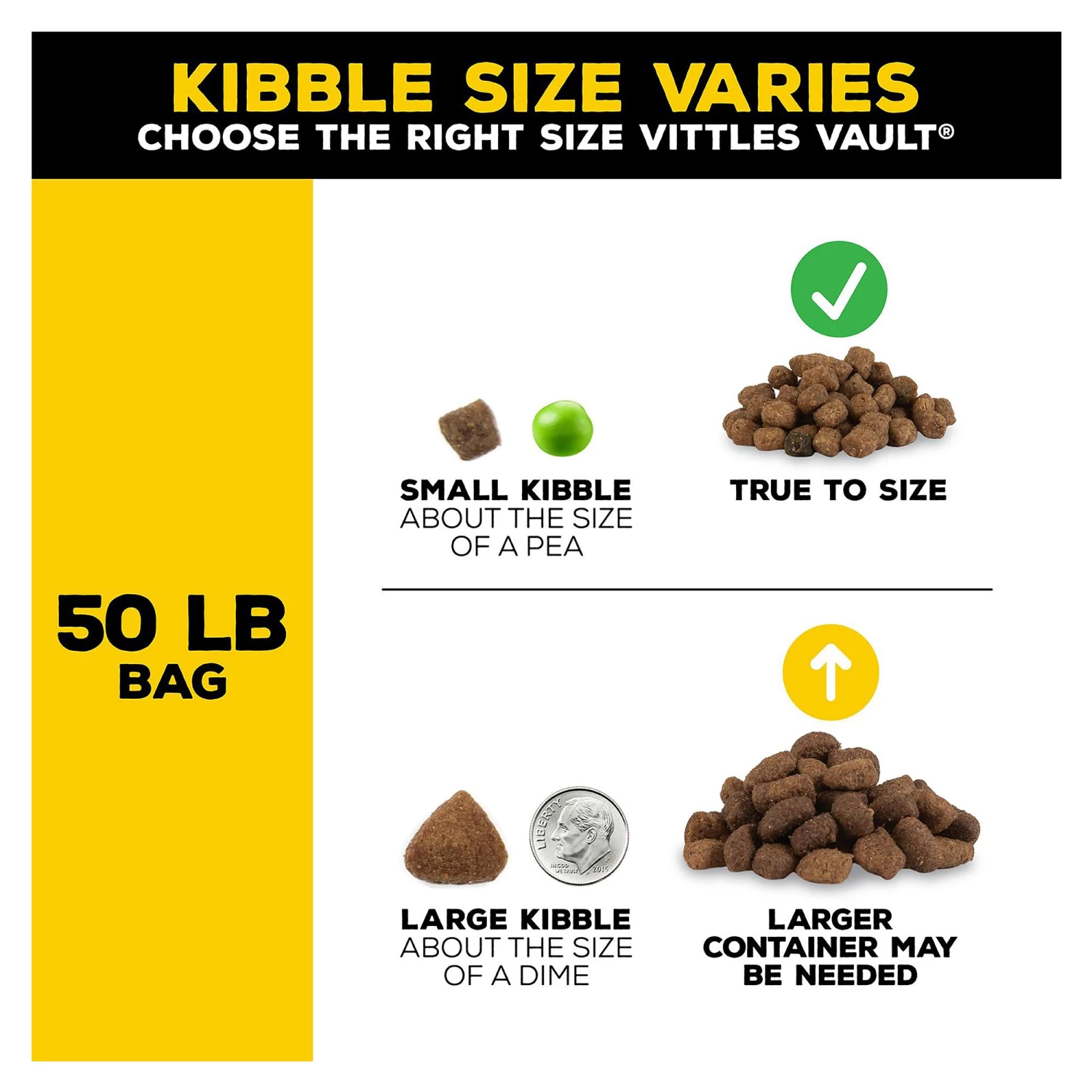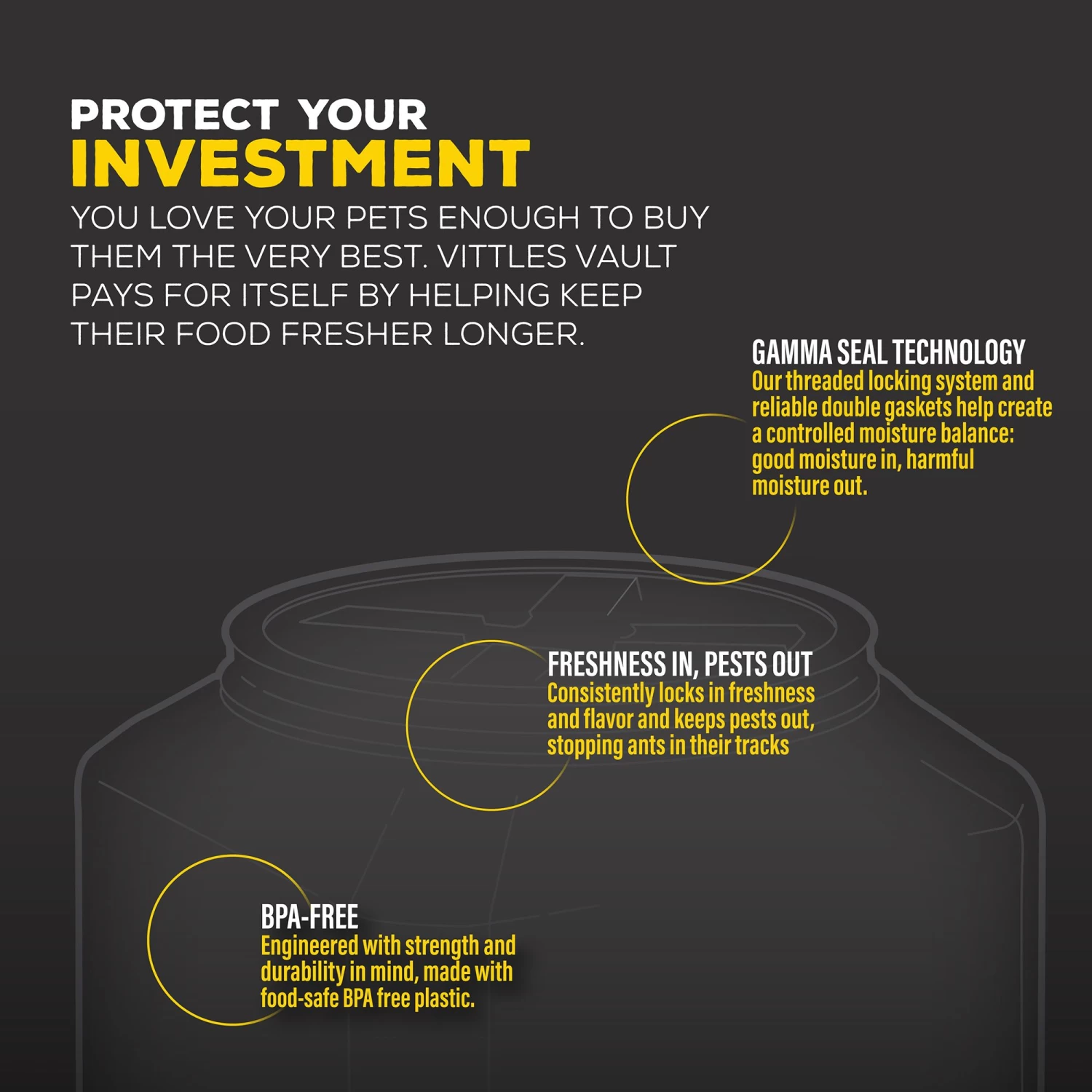 The Vittles Vault Outback 50-lb pet food container is an ideal airtight food storage solution for your pet. It’s constructed of heavy-duty HDPE food-grade plastic, safe for both pet food and people food. The patented sealing system will extend the life of your pet’s food and keep it fresher longer, while maintaining nutritional integrity. This sealing system also ensures that the container is both pest-proof and waterproof, so you can store this container indoors, or out.