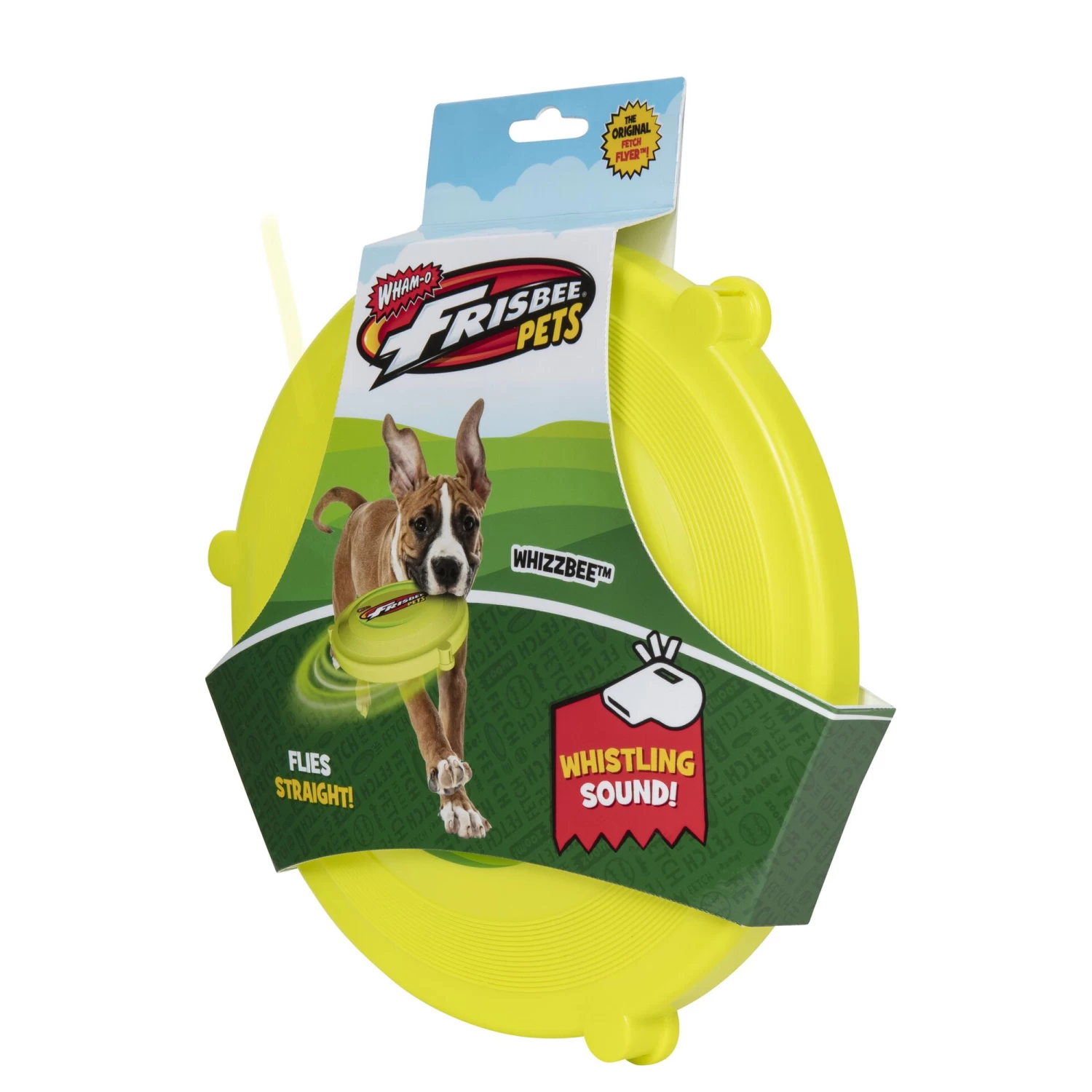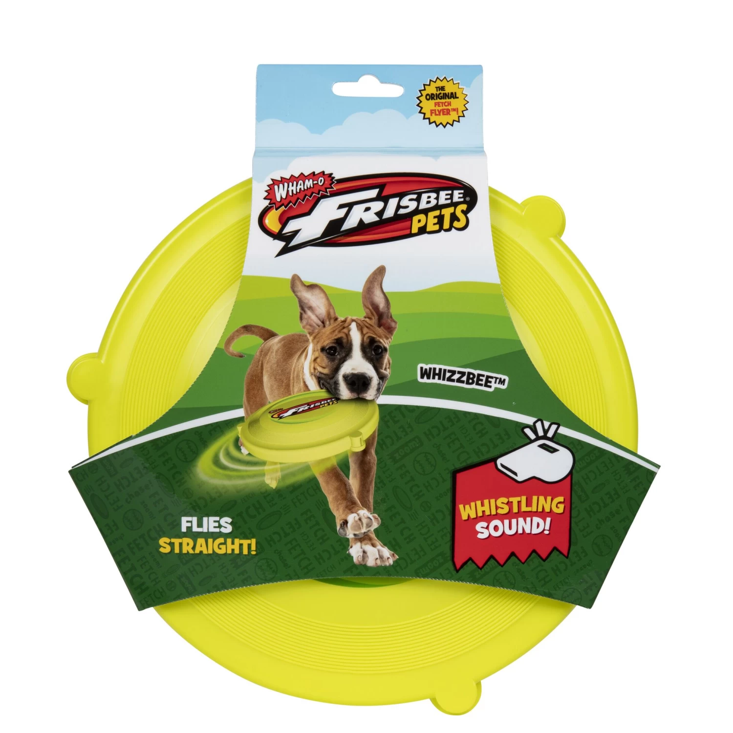 The Wham-O Frisbee Whizzbee is the high-flying, whistling, floatable disc dog toy that every owner enjoys, and every dog begs for! The Original Fetch Flyer was made with your four-legged friend in mind. With the curved edge and the soft, durable rubber, the Frisbee Whizzbee is easy to throw and gentle for your dog to catch. Playtime will become engaging for your pets as you throw the flying disc and they hear the whistle. The specially designed whistle chambers create a whistling sound as the wind passes through when thrown. Take your Frisbee Whizzbee anywhere you take your pet and enjoy interactive playtime together.