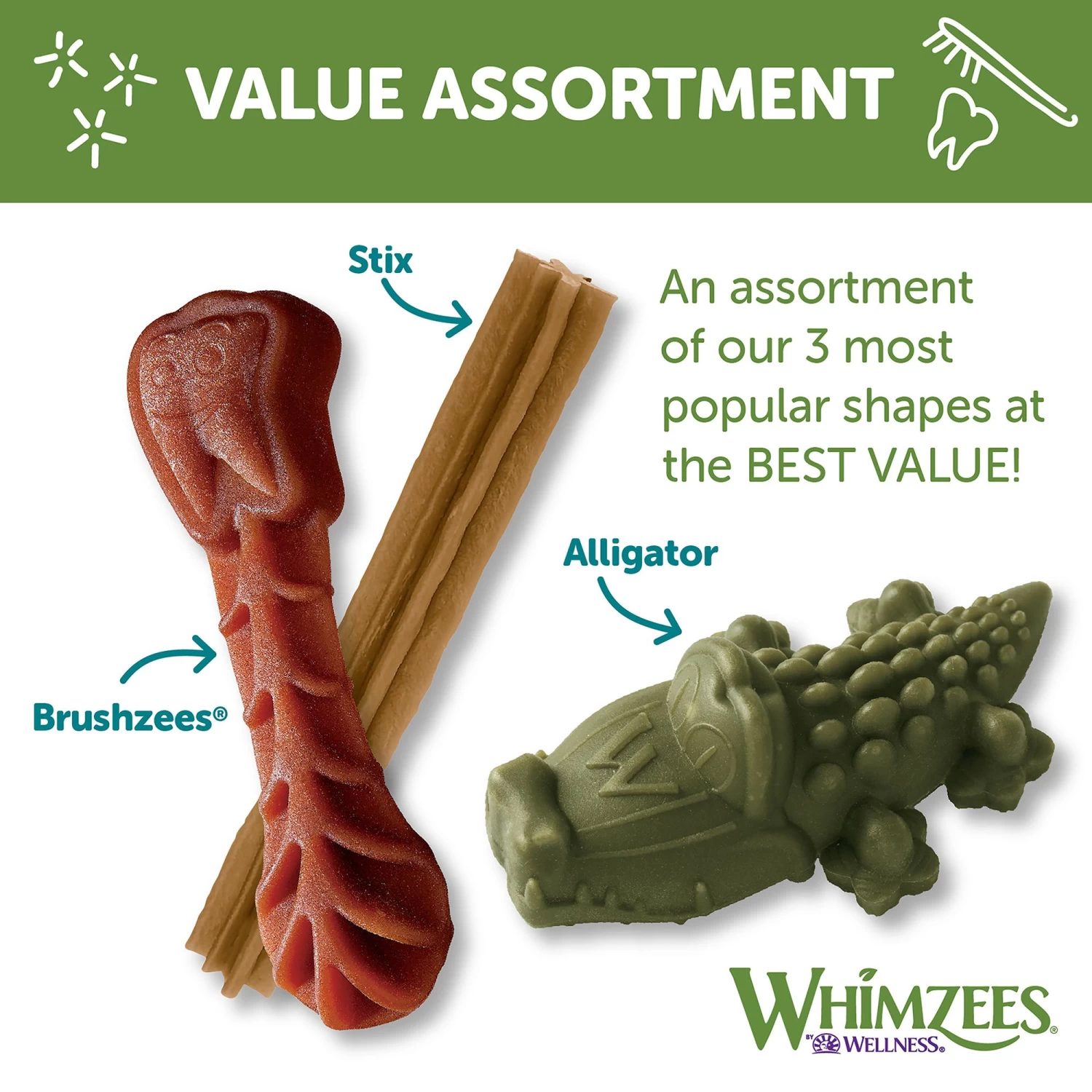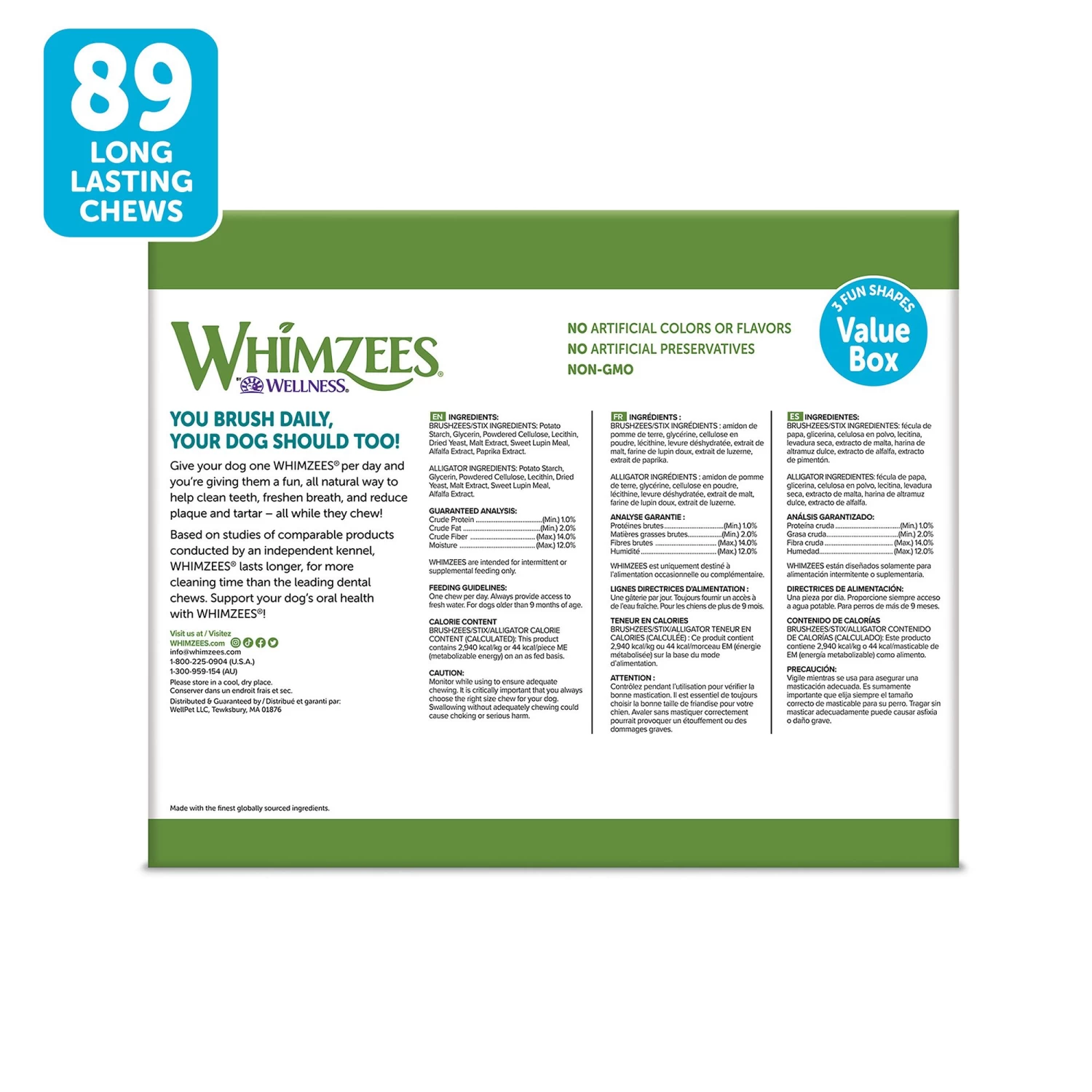 Give your dog one WHIMZEES by Wellness per day and you’re giving them a fun, all natural way to help clean teeth, freshen breath, and reduce plaque and tartar – all while they chew! Dental disease is the number one health issue for dogs, affecting 80% of adult dogs and 96% of senior dogs. That’s why we believe it’s more important than ever to take an active role in your pup’s at-home dental care. What separates WHIMZEES by Wellness from the pack? Designed by our team of pet health experts, WHIMZEES by Wellness are scientifically proven to help control plaque and tartar, improve breath odor, and decrease gingivitis. Our treats clean two times better than a leading competitor*, and deliver three times longer chew time*. A longer chew time means a longer cleaning time – all to support your dog’s dental health. You brush daily, your dog should too!